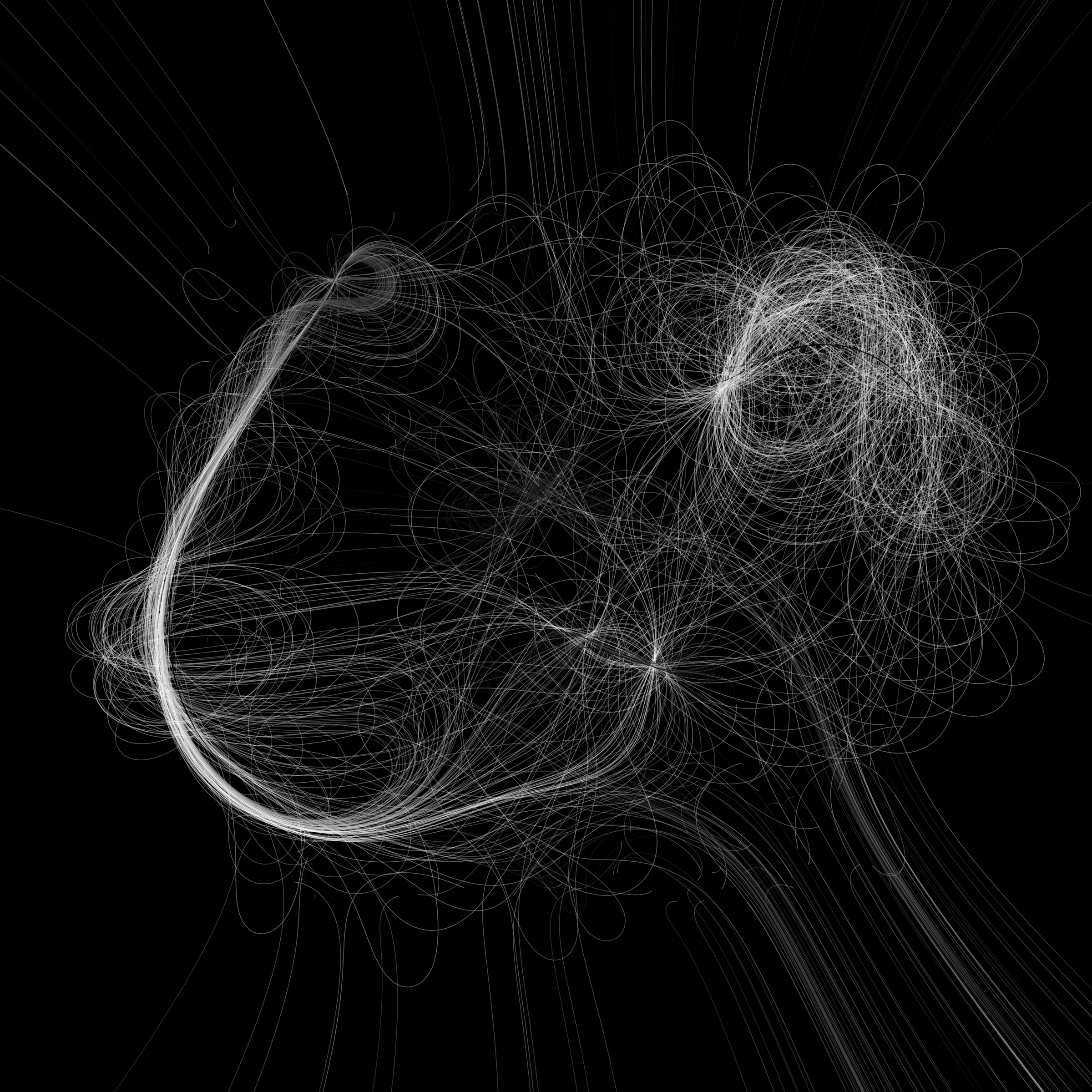 “Phototaxis” is a simulated environment populated by simple machines. After Valentino Braitenberg’s 1984 book “Vehicles,” there are four kinds of machines with different wiring and behaviors: Explorers, Aggressors, Lovers, and Cowards. Each line charts the history of one machine’s movement. The core of this code was the foundation for my MicroImage series of works dating back to 2001. I’ve worked on it in fits and starts since then, and in 2021 it was further developed for Art Blocks. Press ‘P’ to play/pause, ‘B’ for the big bang, ‘1’–’5’ to change the magnification, and ‘L’ to reveal the lights’ locations.