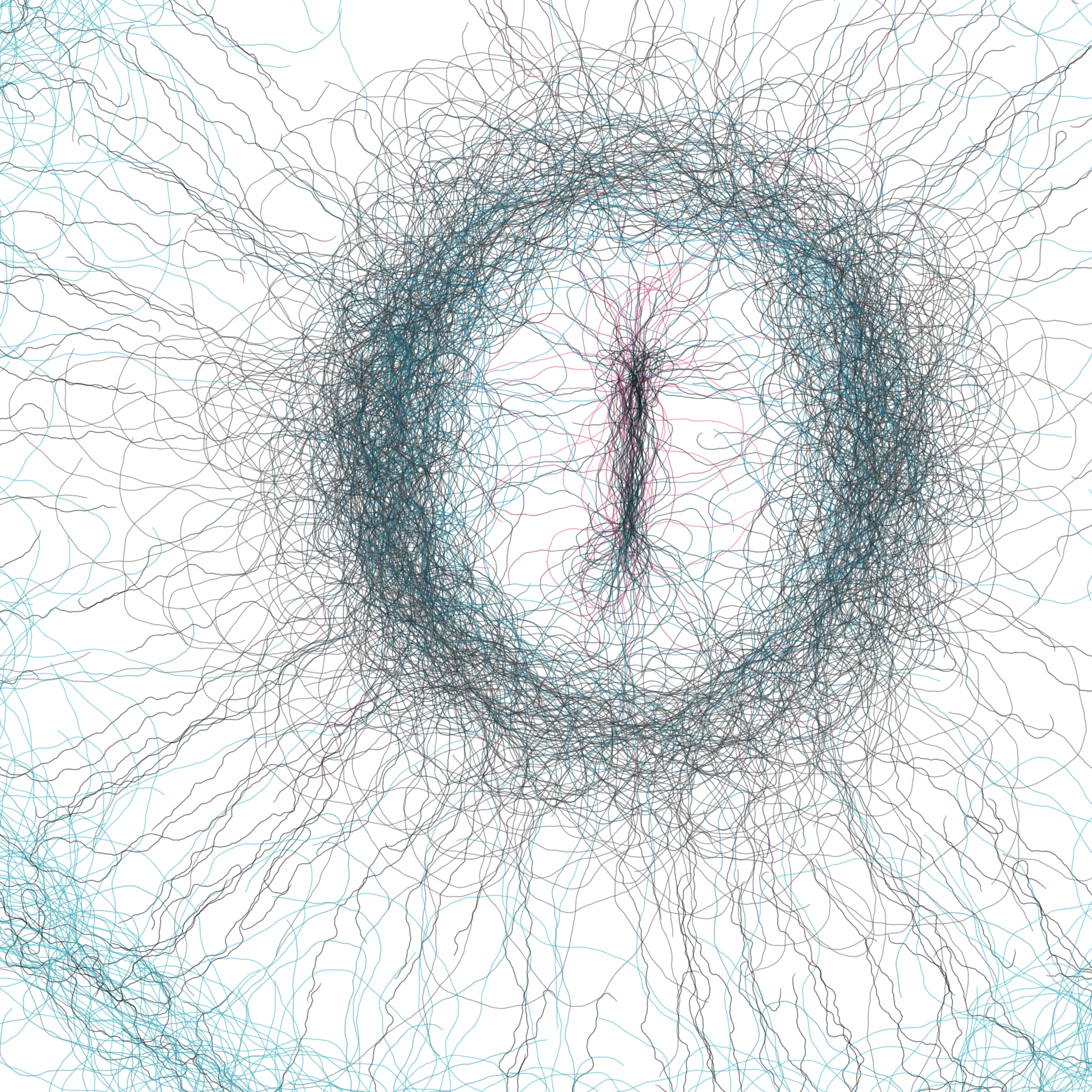“Phototaxis” is a simulated environment populated by simple machines. After Valentino Braitenberg’s 1984 book “Vehicles,” there are four kinds of machines with different wiring and behaviors: Explorers, Aggressors, Lovers, and Cowards. Each line charts the history of one machine’s movement. The core of this code was the foundation for my MicroImage series of works dating back to 2001. I’ve worked on it in fits and starts since then, and in 2021 it was further developed for Art Blocks. Press ‘P’ to play/pause, ‘B’ for the big bang, ‘1’–’5’ to change the magnification, and ‘L’ to reveal the lights’ locations.