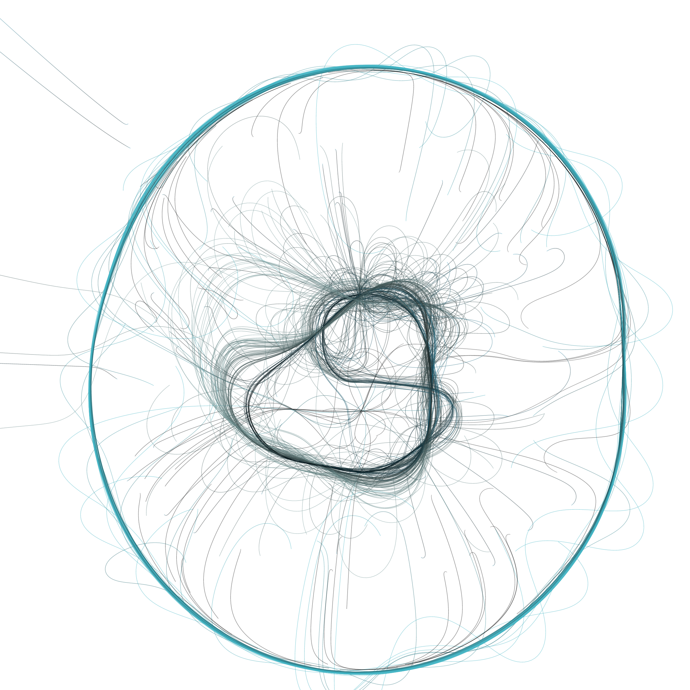 “Phototaxis” is a simulated environment populated by simple machines. After Valentino Braitenberg’s 1984 book “Vehicles,” there are four kinds of machines with different wiring and behaviors: Explorers, Aggressors, Lovers, and Cowards. Each line charts the history of one machine’s movement. The core of this code was the foundation for my MicroImage series of works dating back to 2001. I’ve worked on it in fits and starts since then, and in 2021 it was further developed for Art Blocks. Press ‘P’ to play/pause, ‘B’ for the big bang, ‘1’–’5’ to change the magnification, and ‘L’ to reveal the lights’ locations.