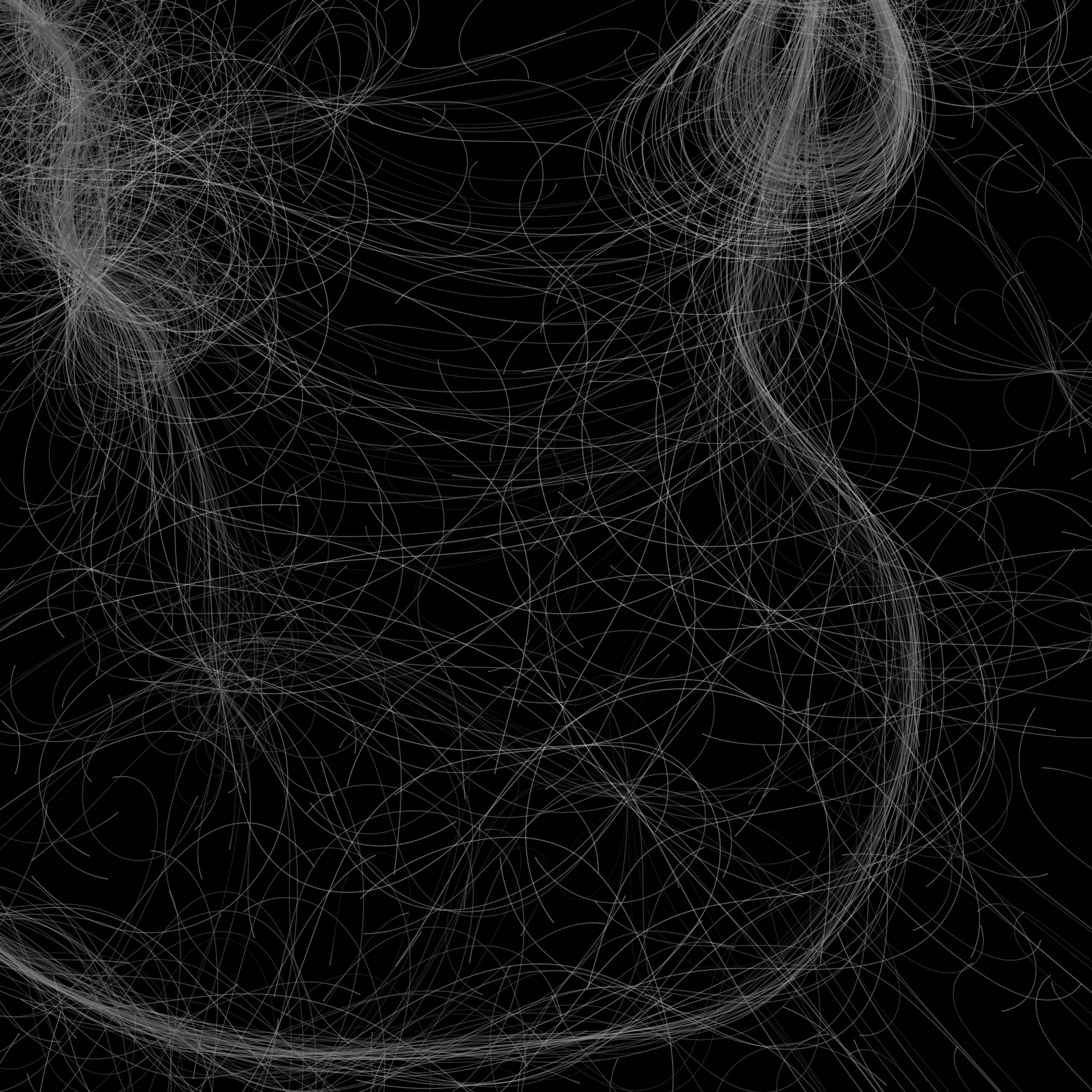 “Phototaxis” is a simulated environment populated by simple machines. After Valentino Braitenberg’s 1984 book “Vehicles,” there are four kinds of machines with different wiring and behaviors: Explorers, Aggressors, Lovers, and Cowards. Each line charts the history of one machine’s movement. The core of this code was the foundation for my MicroImage series of works dating back to 2001. I’ve worked on it in fits and starts since then, and in 2021 it was further developed for Art Blocks. Press ‘P’ to play/pause, ‘B’ for the big bang, ‘1’–’5’ to change the magnification, and ‘L’ to reveal the lights’ locations.