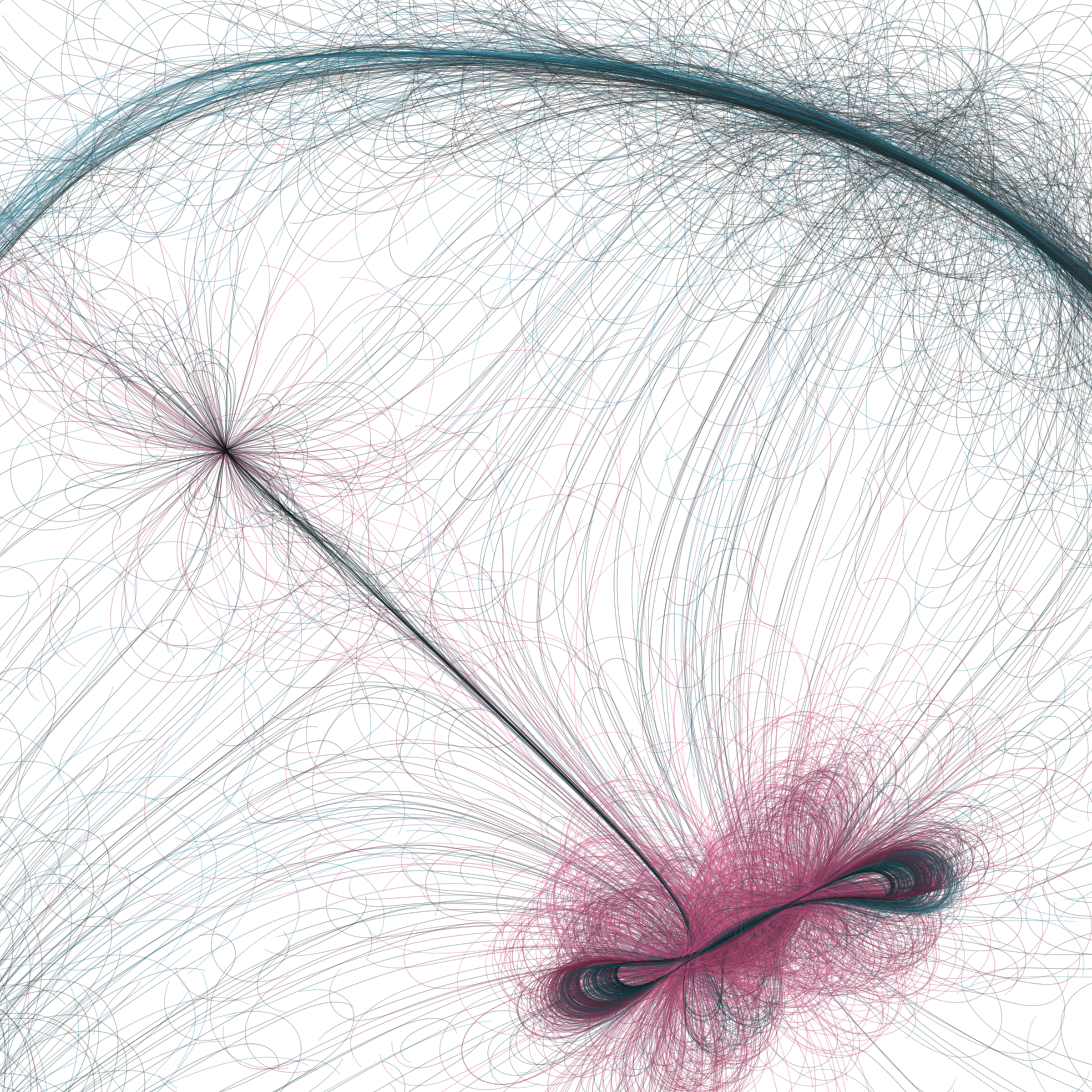 “Phototaxis” is a simulated environment populated by simple machines. After Valentino Braitenberg’s 1984 book “Vehicles,” there are four kinds of machines with different wiring and behaviors: Explorers, Aggressors, Lovers, and Cowards. Each line charts the history of one machine’s movement. The core of this code was the foundation for my MicroImage series of works dating back to 2001. I’ve worked on it in fits and starts since then, and in 2021 it was further developed for Art Blocks. Press ‘P’ to play/pause, ‘B’ for the big bang, ‘1’–’5’ to change the magnification, and ‘L’ to reveal the lights’ locations.