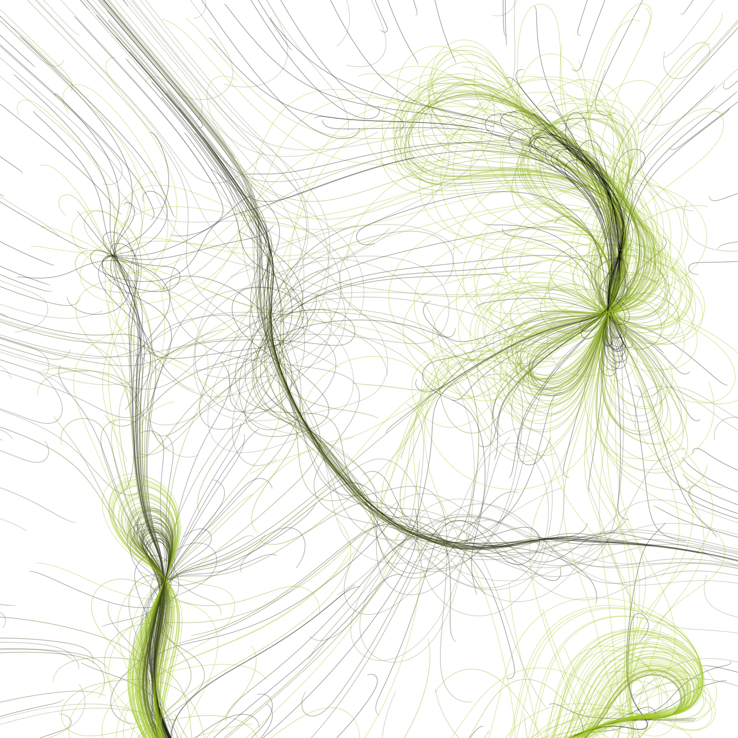 “Phototaxis” is a simulated environment populated by simple machines. After Valentino Braitenberg’s 1984 book “Vehicles,” there are four kinds of machines with different wiring and behaviors: Explorers, Aggressors, Lovers, and Cowards. Each line charts the history of one machine’s movement. The core of this code was the foundation for my MicroImage series of works dating back to 2001. I’ve worked on it in fits and starts since then, and in 2021 it was further developed for Art Blocks. Press ‘P’ to play/pause, ‘B’ for the big bang, ‘1’–’5’ to change the magnification, and ‘L’ to reveal the lights’ locations.