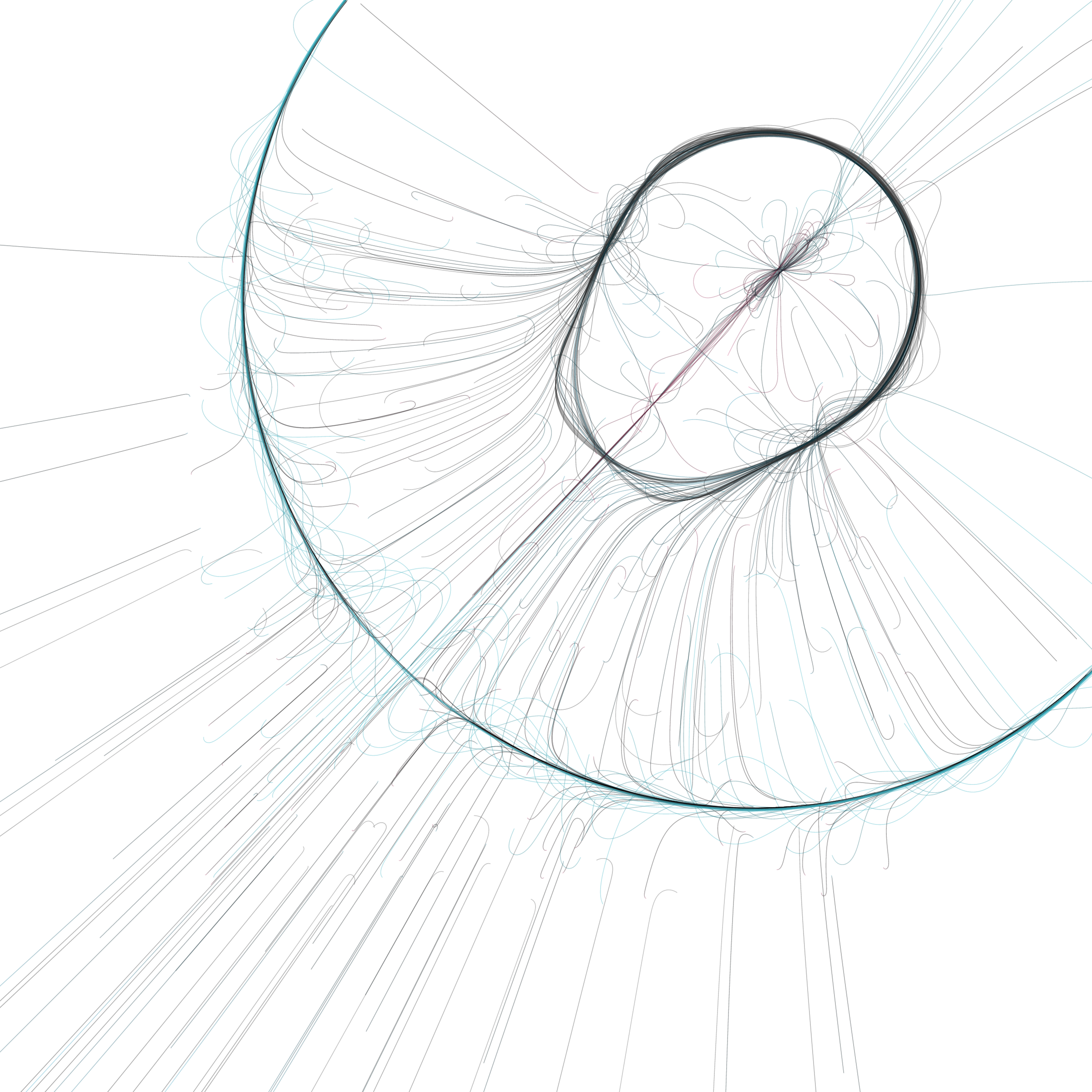 “Phototaxis” is a simulated environment populated by simple machines. After Valentino Braitenberg’s 1984 book “Vehicles,” there are four kinds of machines with different wiring and behaviors: Explorers, Aggressors, Lovers, and Cowards. Each line charts the history of one machine’s movement. The core of this code was the foundation for my MicroImage series of works dating back to 2001. I’ve worked on it in fits and starts since then, and in 2021 it was further developed for Art Blocks. Press ‘P’ to play/pause, ‘B’ for the big bang, ‘1’–’5’ to change the magnification, and ‘L’ to reveal the lights’ locations.