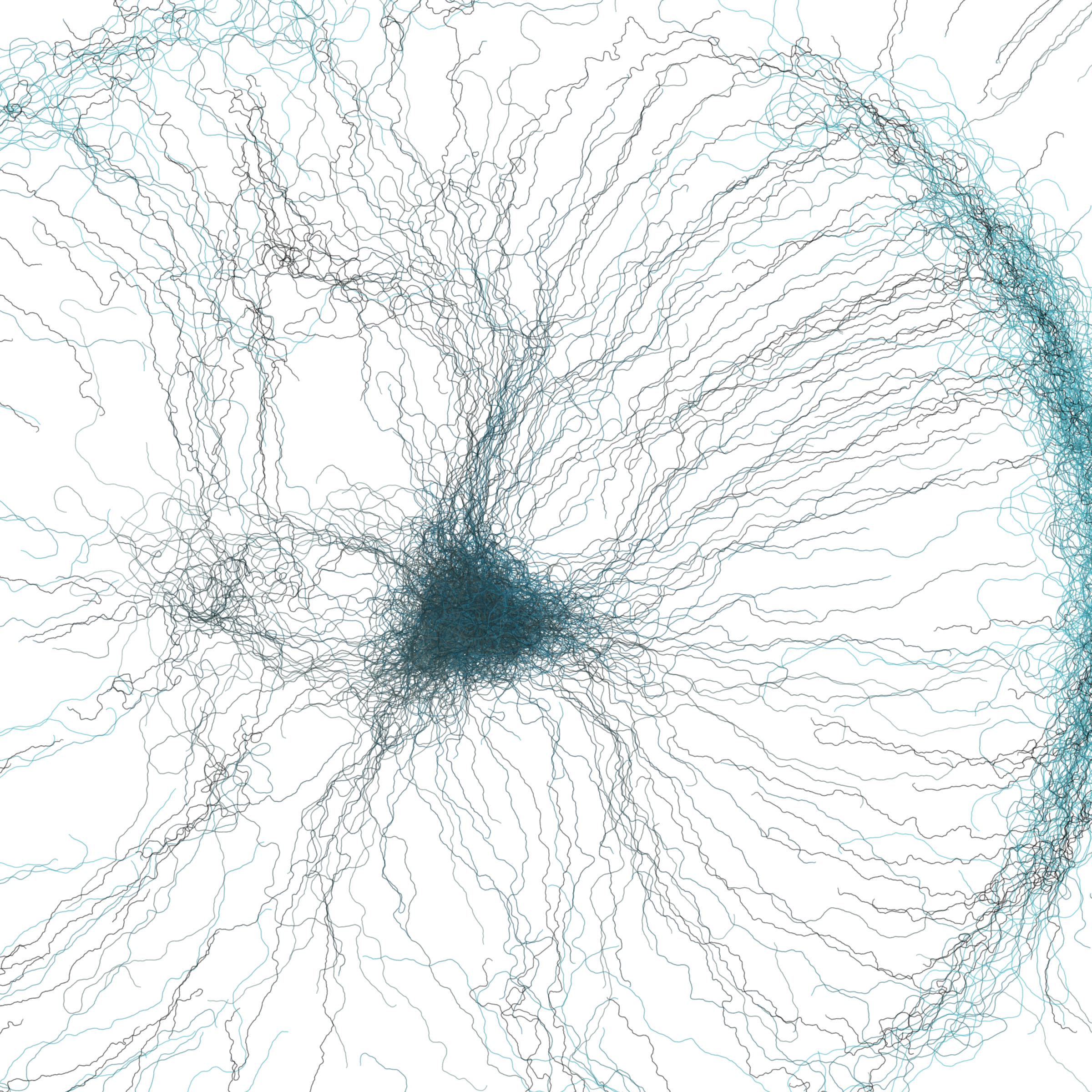 “Phototaxis” is a simulated environment populated by simple machines. After Valentino Braitenberg’s 1984 book “Vehicles,” there are four kinds of machines with different wiring and behaviors: Explorers, Aggressors, Lovers, and Cowards. Each line charts the history of one machine’s movement. The core of this code was the foundation for my MicroImage series of works dating back to 2001. I’ve worked on it in fits and starts since then, and in 2021 it was further developed for Art Blocks. Press ‘P’ to play/pause, ‘B’ for the big bang, ‘1’–’5’ to change the magnification, and ‘L’ to reveal the lights’ locations.