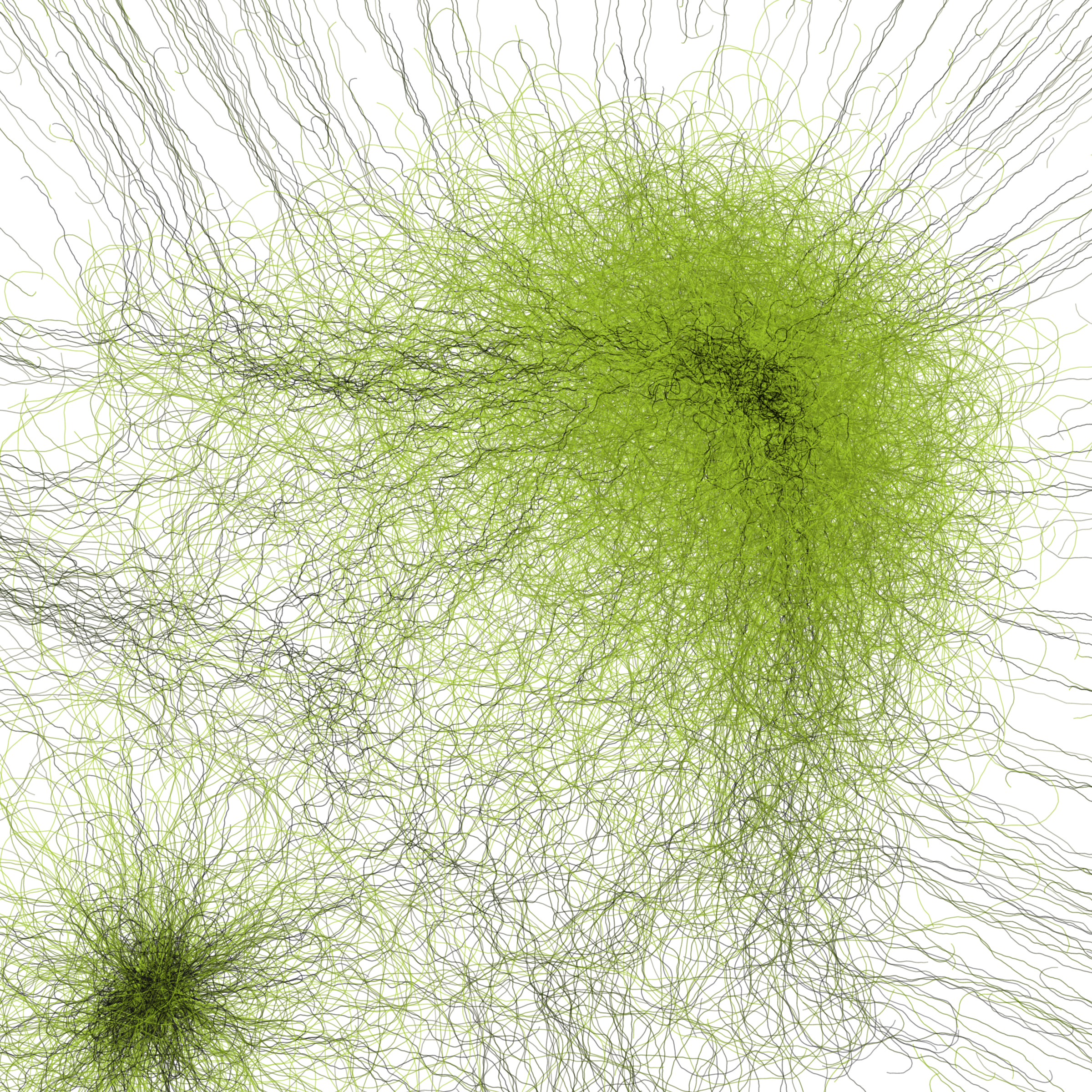 “Phototaxis” is a simulated environment populated by simple machines. After Valentino Braitenberg’s 1984 book “Vehicles,” there are four kinds of machines with different wiring and behaviors: Explorers, Aggressors, Lovers, and Cowards. Each line charts the history of one machine’s movement. The core of this code was the foundation for my MicroImage series of works dating back to 2001. I’ve worked on it in fits and starts since then, and in 2021 it was further developed for Art Blocks. Press ‘P’ to play/pause, ‘B’ for the big bang, ‘1’–’5’ to change the magnification, and ‘L’ to reveal the lights’ locations.