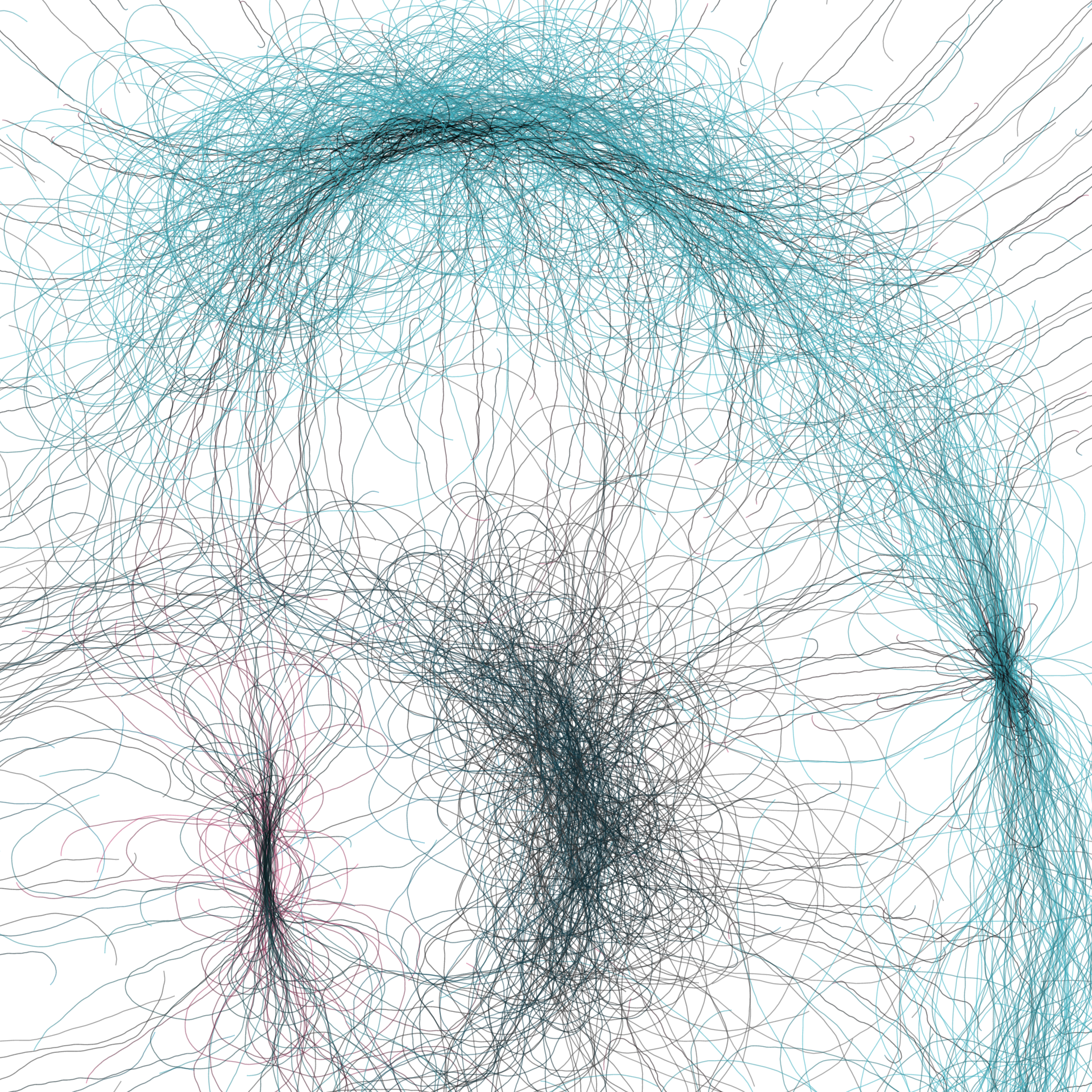 “Phototaxis” is a simulated environment populated by simple machines. After Valentino Braitenberg’s 1984 book “Vehicles,” there are four kinds of machines with different wiring and behaviors: Explorers, Aggressors, Lovers, and Cowards. Each line charts the history of one machine’s movement. The core of this code was the foundation for my MicroImage series of works dating back to 2001. I’ve worked on it in fits and starts since then, and in 2021 it was further developed for Art Blocks. Press ‘P’ to play/pause, ‘B’ for the big bang, ‘1’–’5’ to change the magnification, and ‘L’ to reveal the lights’ locations.