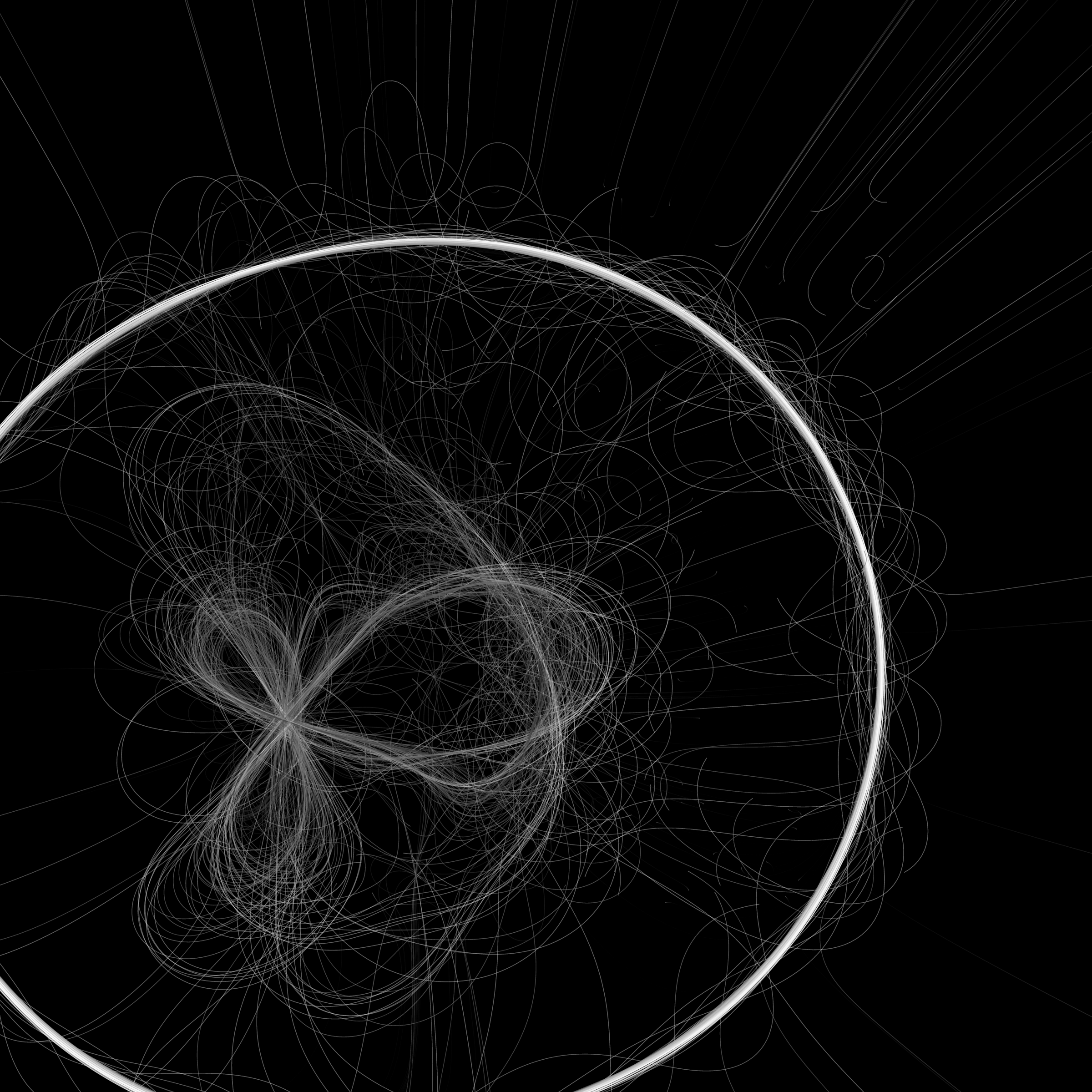 “Phototaxis” is a simulated environment populated by simple machines. After Valentino Braitenberg’s 1984 book “Vehicles,” there are four kinds of machines with different wiring and behaviors: Explorers, Aggressors, Lovers, and Cowards. Each line charts the history of one machine’s movement. The core of this code was the foundation for my MicroImage series of works dating back to 2001. I’ve worked on it in fits and starts since then, and in 2021 it was further developed for Art Blocks. Press ‘P’ to play/pause, ‘B’ for the big bang, ‘1’–’5’ to change the magnification, and ‘L’ to reveal the lights’ locations.