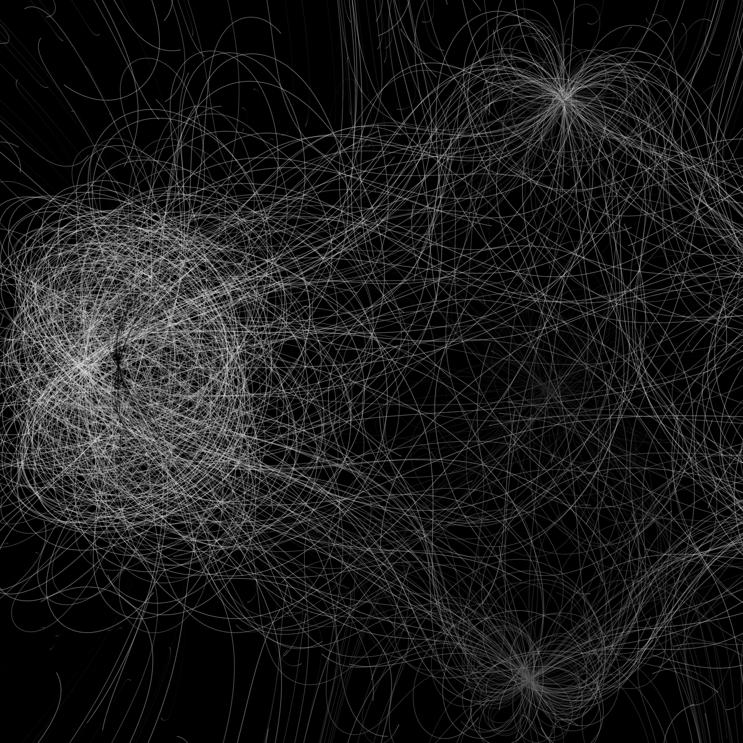 “Phototaxis” is a simulated environment populated by simple machines. After Valentino Braitenberg’s 1984 book “Vehicles,” there are four kinds of machines with different wiring and behaviors: Explorers, Aggressors, Lovers, and Cowards. Each line charts the history of one machine’s movement. The core of this code was the foundation for my MicroImage series of works dating back to 2001. I’ve worked on it in fits and starts since then, and in 2021 it was further developed for Art Blocks. Press ‘P’ to play/pause, ‘B’ for the big bang, ‘1’–’5’ to change the magnification, and ‘L’ to reveal the lights’ locations.
