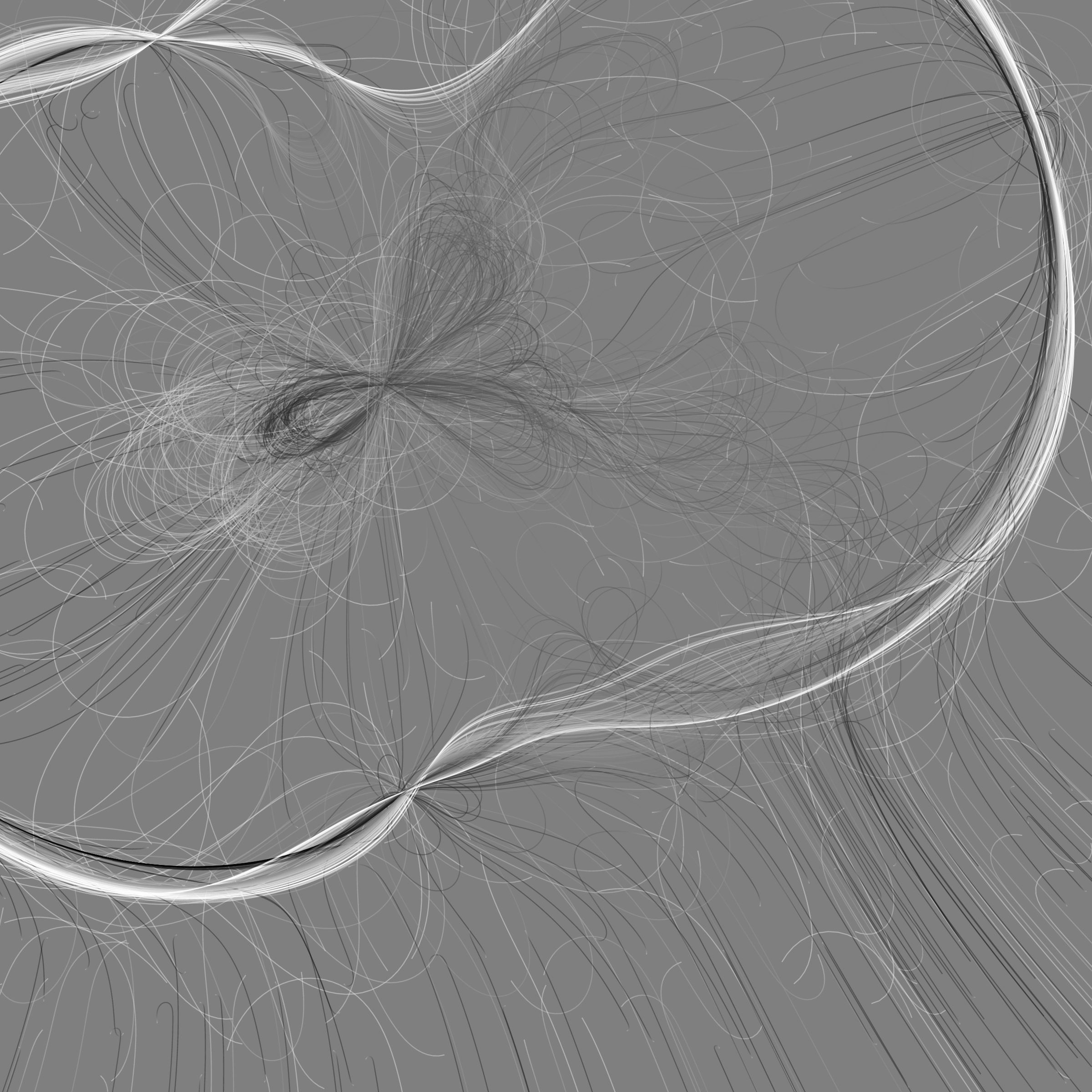 “Phototaxis” is a simulated environment populated by simple machines. After Valentino Braitenberg’s 1984 book “Vehicles,” there are four kinds of machines with different wiring and behaviors: Explorers, Aggressors, Lovers, and Cowards. Each line charts the history of one machine’s movement. The core of this code was the foundation for my MicroImage series of works dating back to 2001. I’ve worked on it in fits and starts since then, and in 2021 it was further developed for Art Blocks. Press ‘P’ to play/pause, ‘B’ for the big bang, ‘1’–’5’ to change the magnification, and ‘L’ to reveal the lights’ locations.