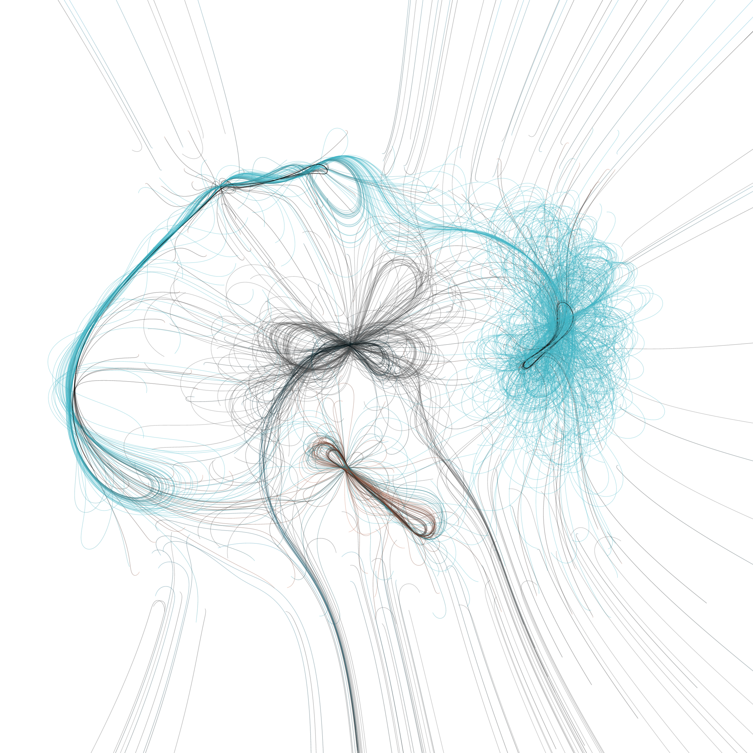 “Phototaxis” is a simulated environment populated by simple machines. After Valentino Braitenberg’s 1984 book “Vehicles,” there are four kinds of machines with different wiring and behaviors: Explorers, Aggressors, Lovers, and Cowards. Each line charts the history of one machine’s movement. The core of this code was the foundation for my MicroImage series of works dating back to 2001. I’ve worked on it in fits and starts since then, and in 2021 it was further developed for Art Blocks. Press ‘P’ to play/pause, ‘B’ for the big bang, ‘1’–’5’ to change the magnification, and ‘L’ to reveal the lights’ locations.