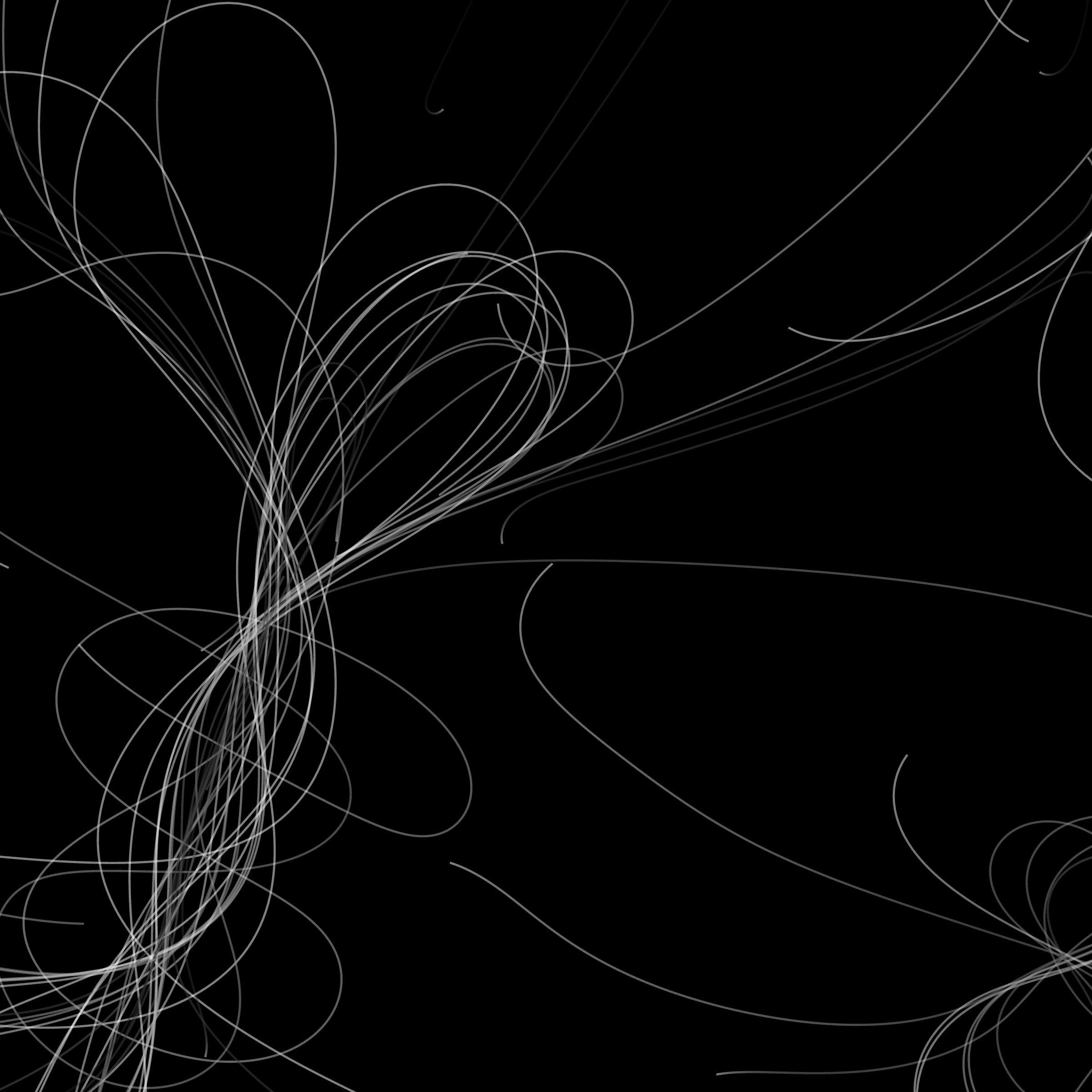 “Phototaxis” is a simulated environment populated by simple machines. After Valentino Braitenberg’s 1984 book “Vehicles,” there are four kinds of machines with different wiring and behaviors: Explorers, Aggressors, Lovers, and Cowards. Each line charts the history of one machine’s movement. The core of this code was the foundation for my MicroImage series of works dating back to 2001. I’ve worked on it in fits and starts since then, and in 2021 it was further developed for Art Blocks. Press ‘P’ to play/pause, ‘B’ for the big bang, ‘1’–’5’ to change the magnification, and ‘L’ to reveal the lights’ locations.