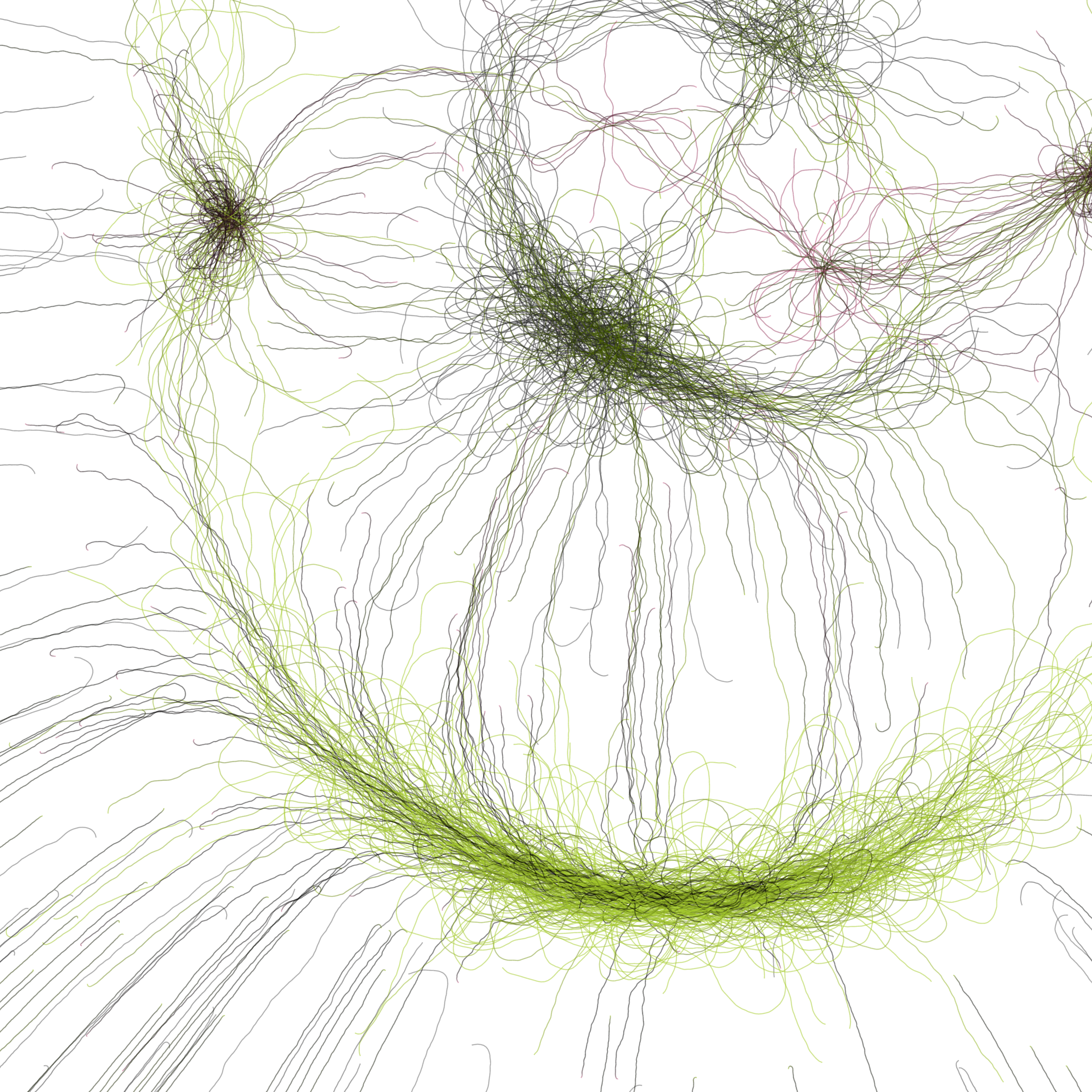 “Phototaxis” is a simulated environment populated by simple machines. After Valentino Braitenberg’s 1984 book “Vehicles,” there are four kinds of machines with different wiring and behaviors: Explorers, Aggressors, Lovers, and Cowards. Each line charts the history of one machine’s movement. The core of this code was the foundation for my MicroImage series of works dating back to 2001. I’ve worked on it in fits and starts since then, and in 2021 it was further developed for Art Blocks. Press ‘P’ to play/pause, ‘B’ for the big bang, ‘1’–’5’ to change the magnification, and ‘L’ to reveal the lights’ locations.
