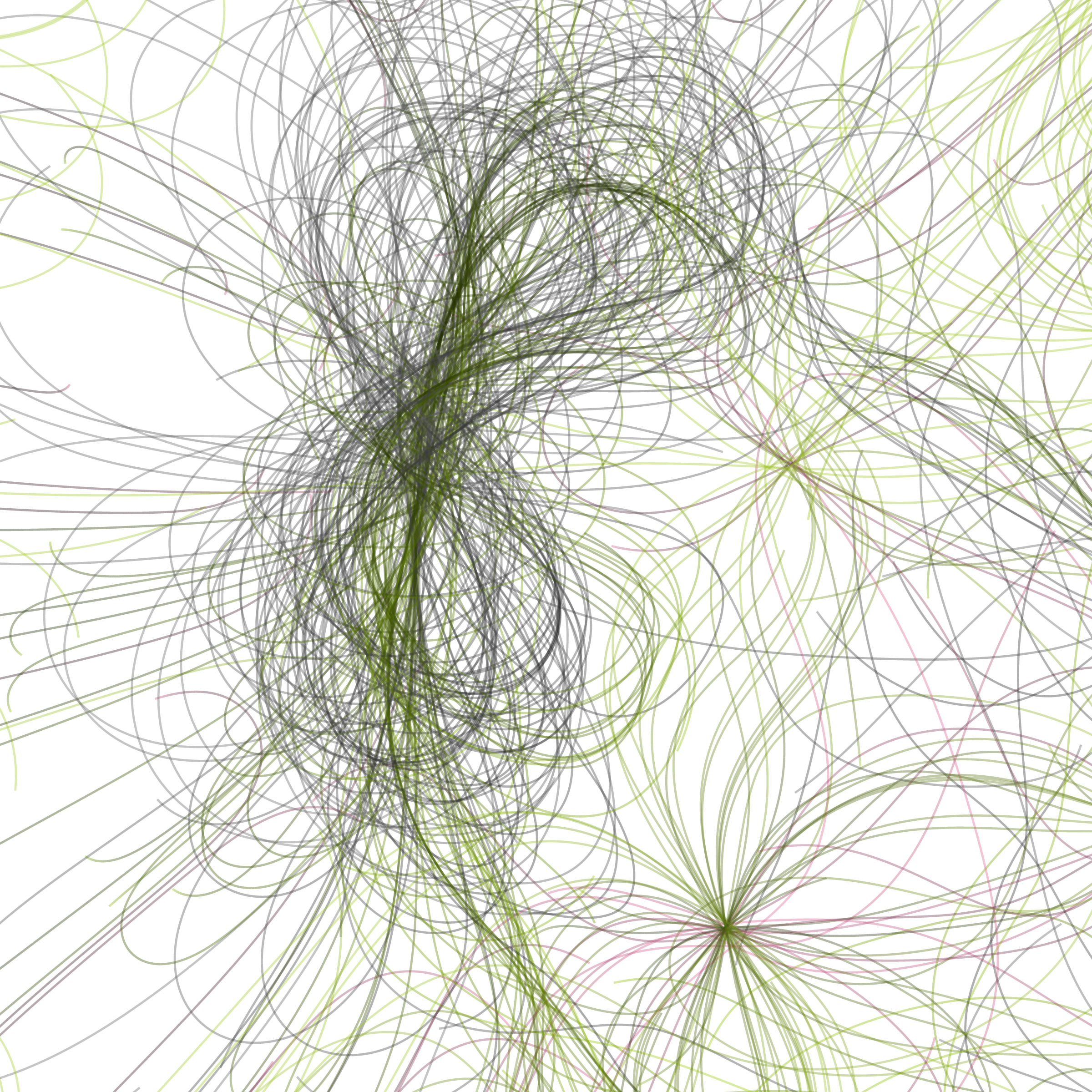 “Phototaxis” is a simulated environment populated by simple machines. After Valentino Braitenberg’s 1984 book “Vehicles,” there are four kinds of machines with different wiring and behaviors: Explorers, Aggressors, Lovers, and Cowards. Each line charts the history of one machine’s movement. The core of this code was the foundation for my MicroImage series of works dating back to 2001. I’ve worked on it in fits and starts since then, and in 2021 it was further developed for Art Blocks. Press ‘P’ to play/pause, ‘B’ for the big bang, ‘1’–’5’ to change the magnification, and ‘L’ to reveal the lights’ locations.