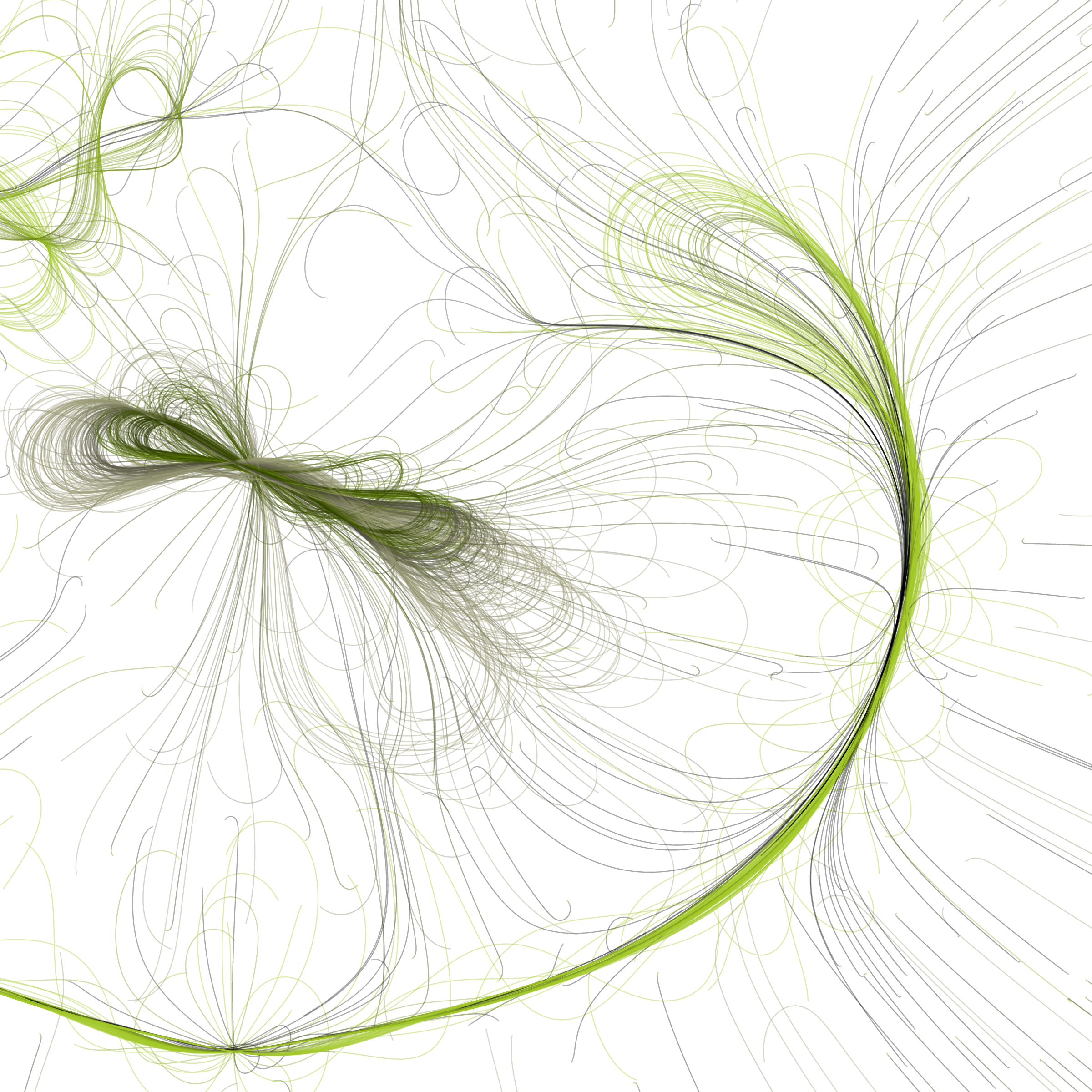 “Phototaxis” is a simulated environment populated by simple machines. After Valentino Braitenberg’s 1984 book “Vehicles,” there are four kinds of machines with different wiring and behaviors: Explorers, Aggressors, Lovers, and Cowards. Each line charts the history of one machine’s movement. The core of this code was the foundation for my MicroImage series of works dating back to 2001. I’ve worked on it in fits and starts since then, and in 2021 it was further developed for Art Blocks. Press ‘P’ to play/pause, ‘B’ for the big bang, ‘1’–’5’ to change the magnification, and ‘L’ to reveal the lights’ locations.
