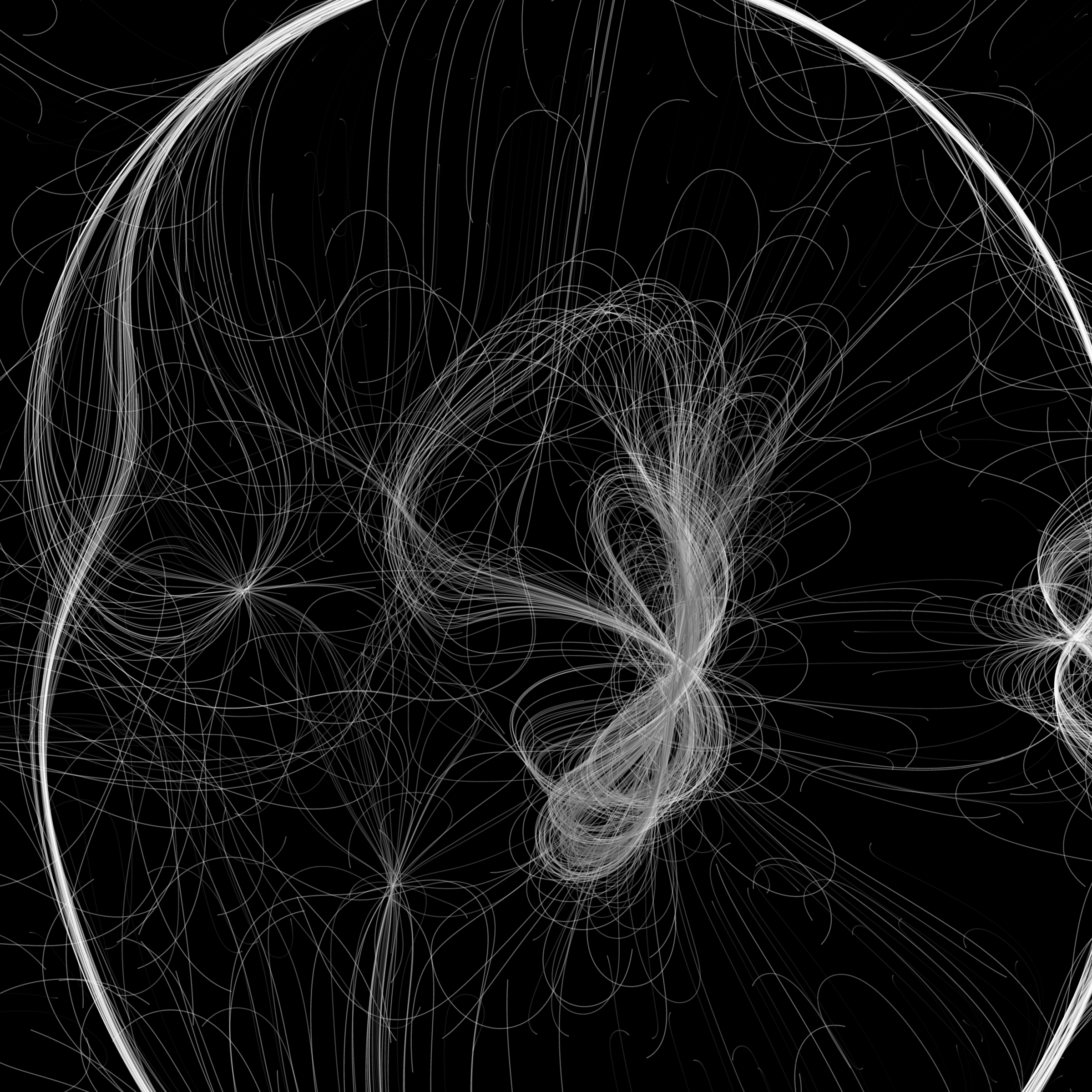 “Phototaxis” is a simulated environment populated by simple machines. After Valentino Braitenberg’s 1984 book “Vehicles,” there are four kinds of machines with different wiring and behaviors: Explorers, Aggressors, Lovers, and Cowards. Each line charts the history of one machine’s movement. The core of this code was the foundation for my MicroImage series of works dating back to 2001. I’ve worked on it in fits and starts since then, and in 2021 it was further developed for Art Blocks. Press ‘P’ to play/pause, ‘B’ for the big bang, ‘1’–’5’ to change the magnification, and ‘L’ to reveal the lights’ locations.