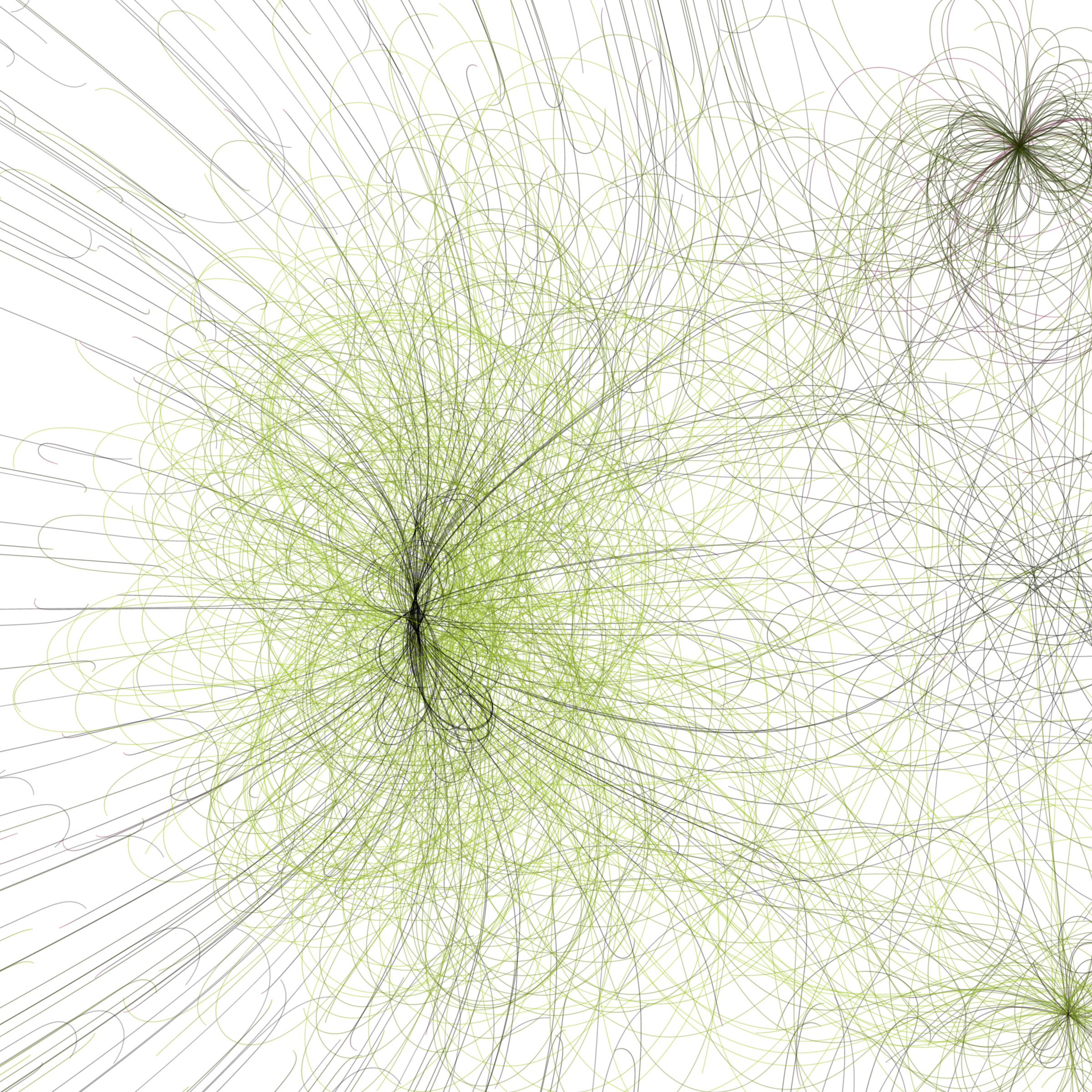 “Phototaxis” is a simulated environment populated by simple machines. After Valentino Braitenberg’s 1984 book “Vehicles,” there are four kinds of machines with different wiring and behaviors: Explorers, Aggressors, Lovers, and Cowards. Each line charts the history of one machine’s movement. The core of this code was the foundation for my MicroImage series of works dating back to 2001. I’ve worked on it in fits and starts since then, and in 2021 it was further developed for Art Blocks. Press ‘P’ to play/pause, ‘B’ for the big bang, ‘1’–’5’ to change the magnification, and ‘L’ to reveal the lights’ locations.