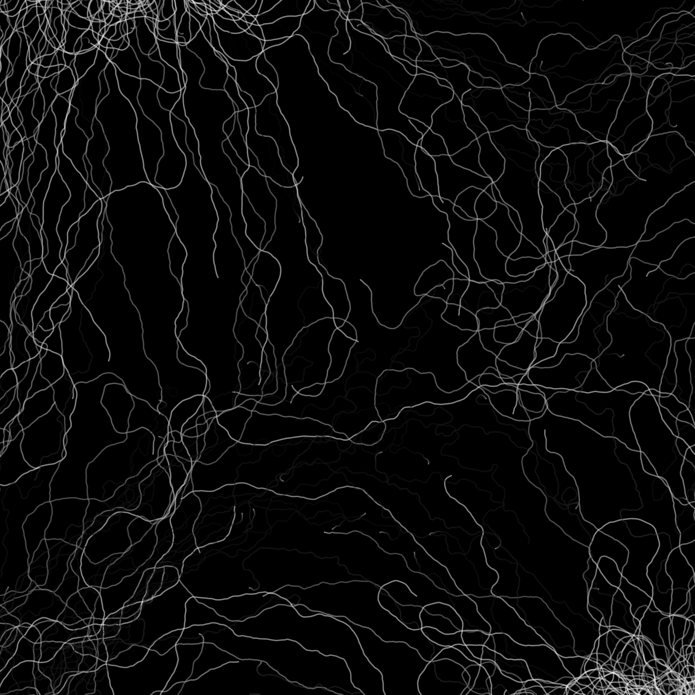 “Phototaxis” is a simulated environment populated by simple machines. After Valentino Braitenberg’s 1984 book “Vehicles,” there are four kinds of machines with different wiring and behaviors: Explorers, Aggressors, Lovers, and Cowards. Each line charts the history of one machine’s movement. The core of this code was the foundation for my MicroImage series of works dating back to 2001. I’ve worked on it in fits and starts since then, and in 2021 it was further developed for Art Blocks. Press ‘P’ to play/pause, ‘B’ for the big bang, ‘1’–’5’ to change the magnification, and ‘L’ to reveal the lights’ locations.