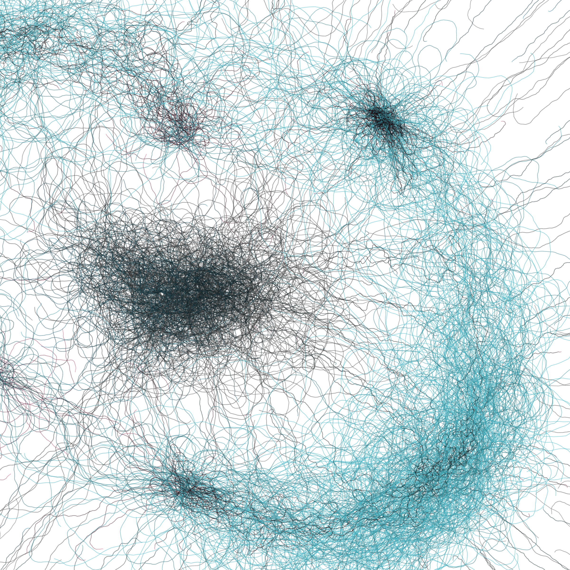 “Phototaxis” is a simulated environment populated by simple machines. After Valentino Braitenberg’s 1984 book “Vehicles,” there are four kinds of machines with different wiring and behaviors: Explorers, Aggressors, Lovers, and Cowards. Each line charts the history of one machine’s movement. The core of this code was the foundation for my MicroImage series of works dating back to 2001. I’ve worked on it in fits and starts since then, and in 2021 it was further developed for Art Blocks. Press ‘P’ to play/pause, ‘B’ for the big bang, ‘1’–’5’ to change the magnification, and ‘L’ to reveal the lights’ locations.