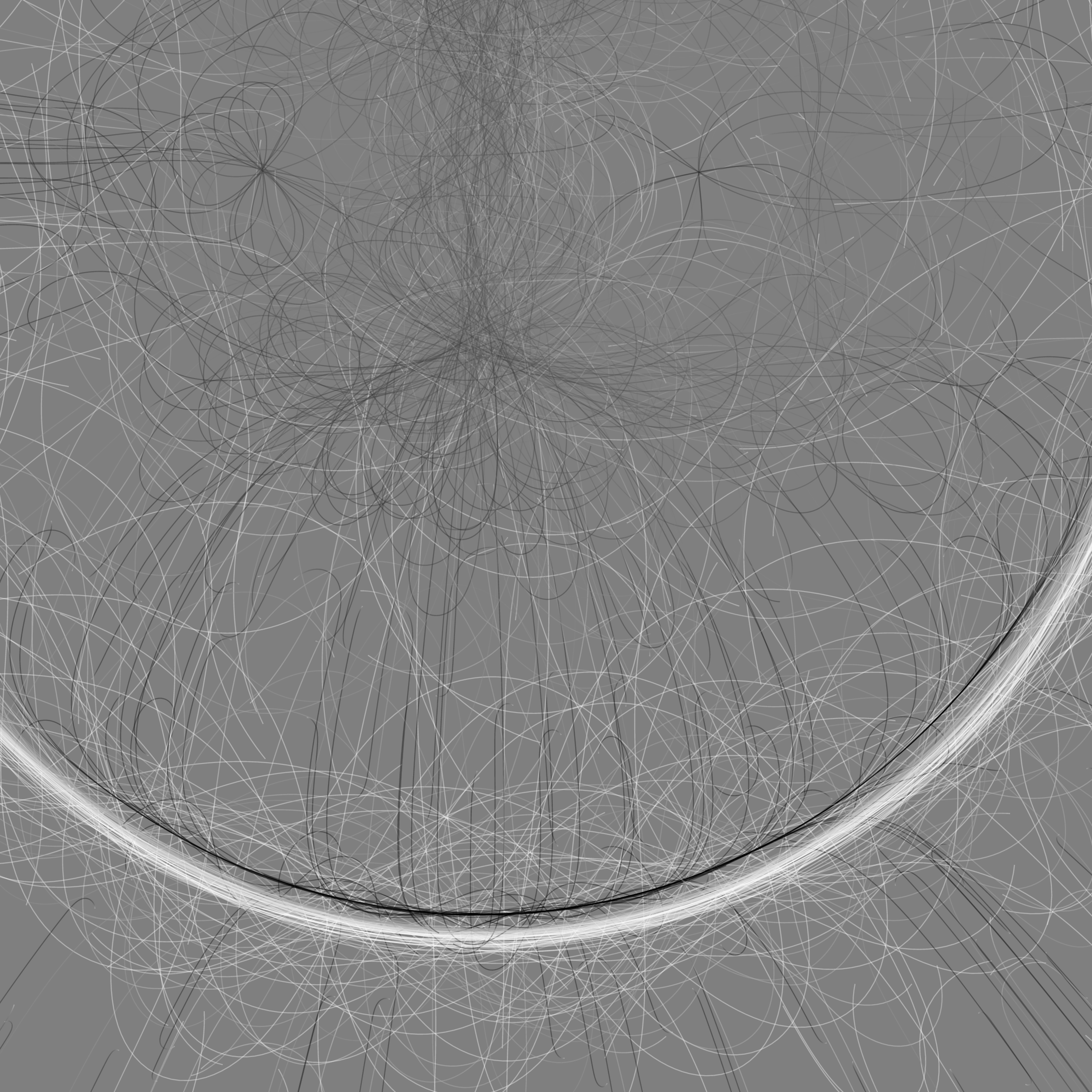 “Phototaxis” is a simulated environment populated by simple machines. After Valentino Braitenberg’s 1984 book “Vehicles,” there are four kinds of machines with different wiring and behaviors: Explorers, Aggressors, Lovers, and Cowards. Each line charts the history of one machine’s movement. The core of this code was the foundation for my MicroImage series of works dating back to 2001. I’ve worked on it in fits and starts since then, and in 2021 it was further developed for Art Blocks. Press ‘P’ to play/pause, ‘B’ for the big bang, ‘1’–’5’ to change the magnification, and ‘L’ to reveal the lights’ locations.