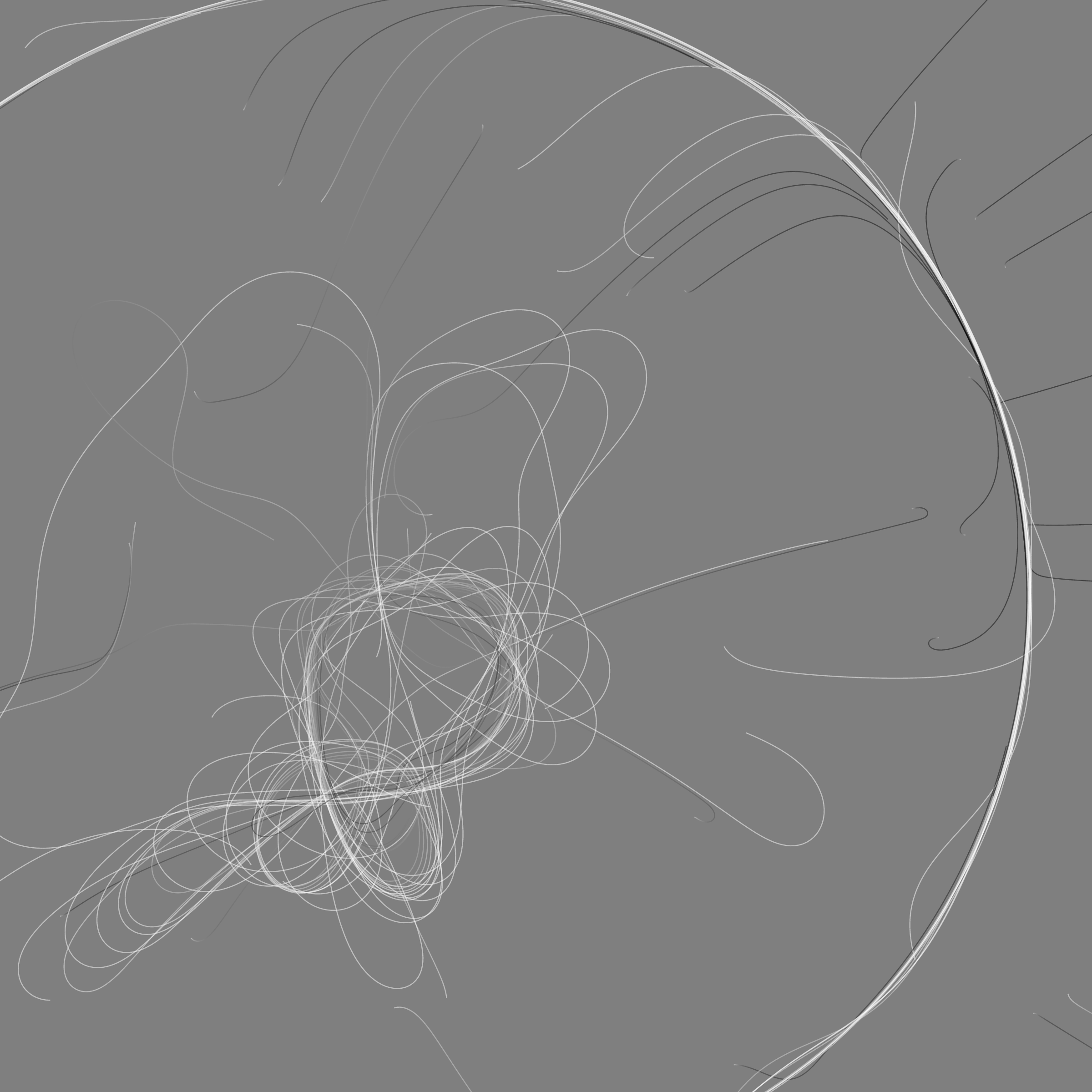 “Phototaxis” is a simulated environment populated by simple machines. After Valentino Braitenberg’s 1984 book “Vehicles,” there are four kinds of machines with different wiring and behaviors: Explorers, Aggressors, Lovers, and Cowards. Each line charts the history of one machine’s movement. The core of this code was the foundation for my MicroImage series of works dating back to 2001. I’ve worked on it in fits and starts since then, and in 2021 it was further developed for Art Blocks. Press ‘P’ to play/pause, ‘B’ for the big bang, ‘1’–’5’ to change the magnification, and ‘L’ to reveal the lights’ locations.