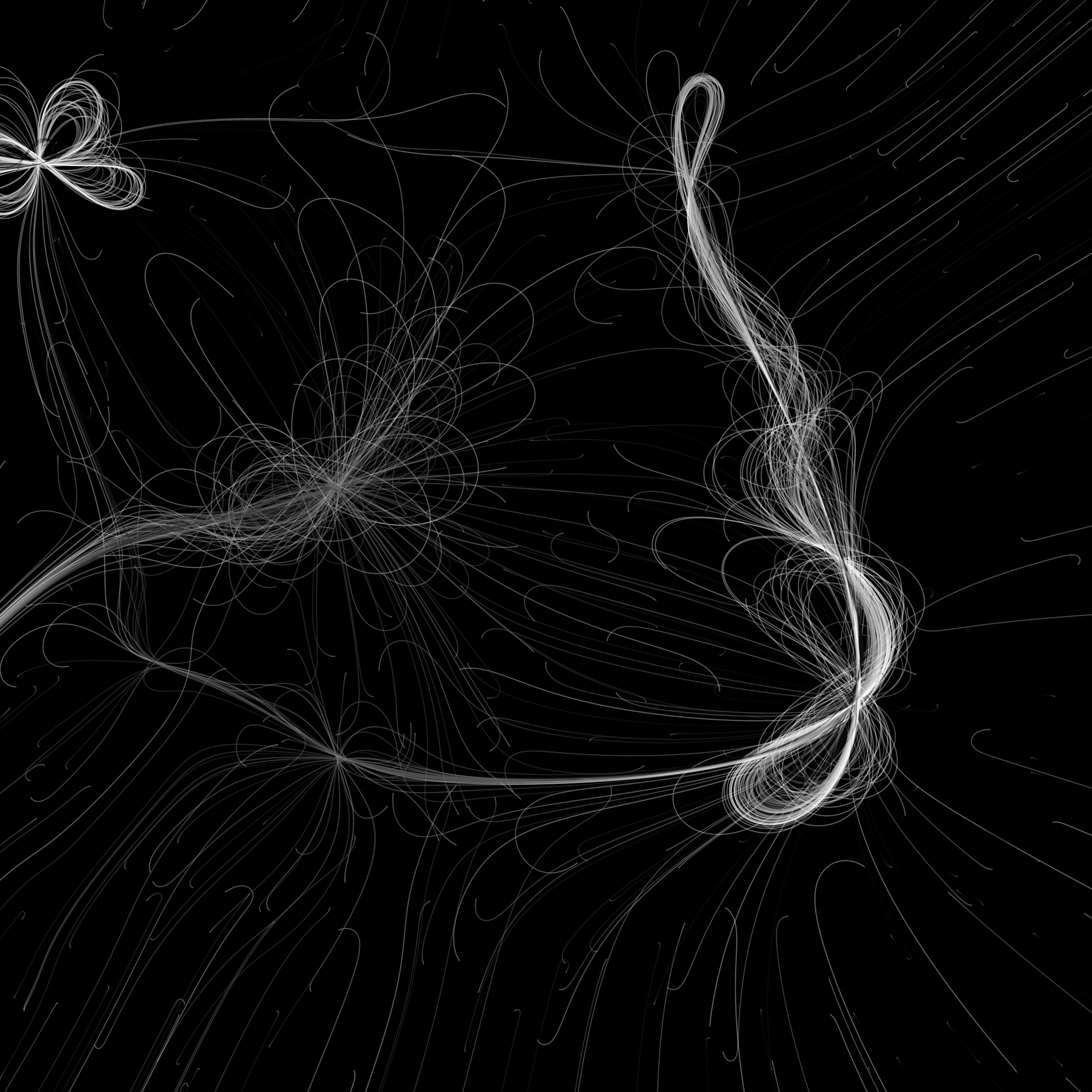 “Phototaxis” is a simulated environment populated by simple machines. After Valentino Braitenberg’s 1984 book “Vehicles,” there are four kinds of machines with different wiring and behaviors: Explorers, Aggressors, Lovers, and Cowards. Each line charts the history of one machine’s movement. The core of this code was the foundation for my MicroImage series of works dating back to 2001. I’ve worked on it in fits and starts since then, and in 2021 it was further developed for Art Blocks. Press ‘P’ to play/pause, ‘B’ for the big bang, ‘1’–’5’ to change the magnification, and ‘L’ to reveal the lights’ locations.