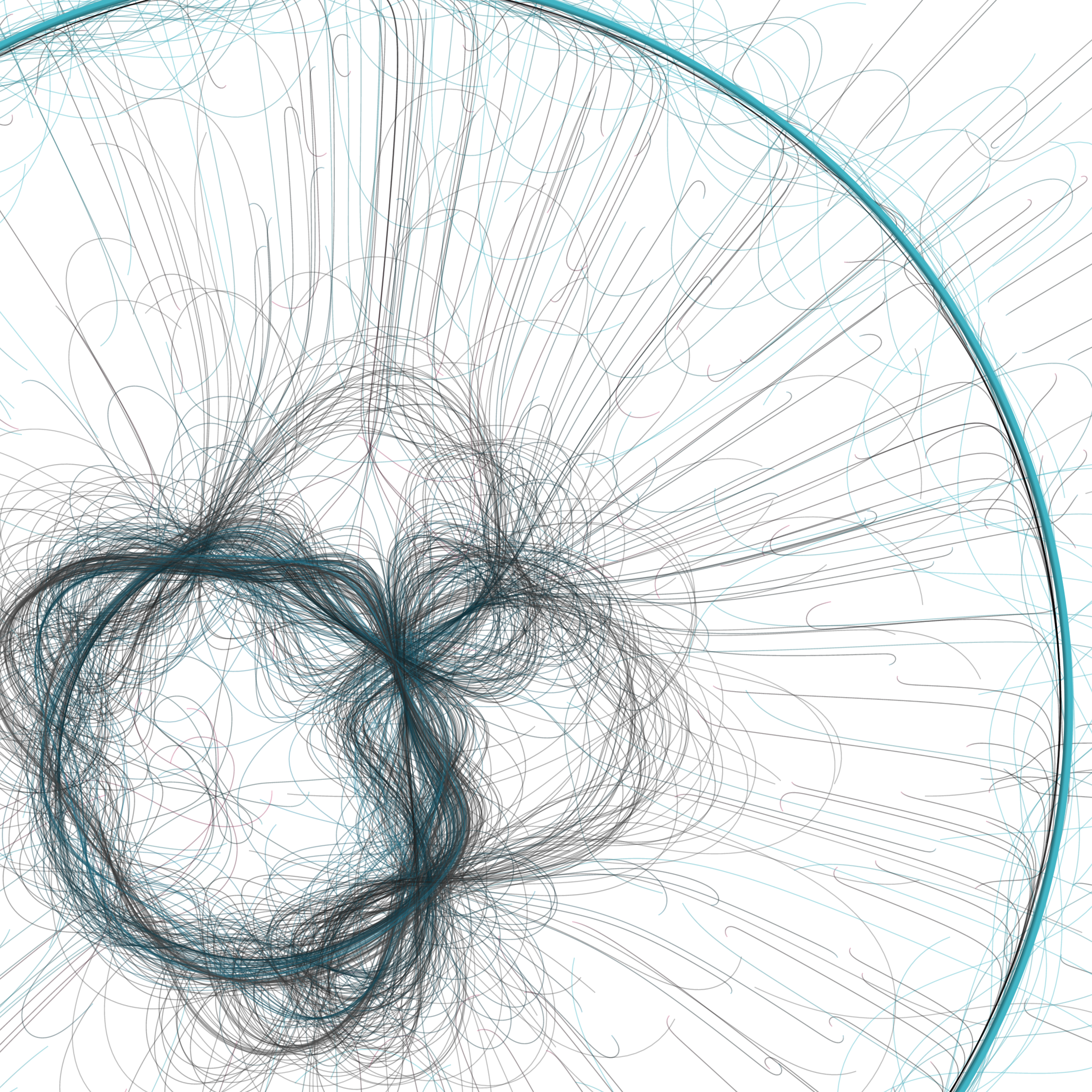 “Phototaxis” is a simulated environment populated by simple machines. After Valentino Braitenberg’s 1984 book “Vehicles,” there are four kinds of machines with different wiring and behaviors: Explorers, Aggressors, Lovers, and Cowards. Each line charts the history of one machine’s movement. The core of this code was the foundation for my MicroImage series of works dating back to 2001. I’ve worked on it in fits and starts since then, and in 2021 it was further developed for Art Blocks. Press ‘P’ to play/pause, ‘B’ for the big bang, ‘1’–’5’ to change the magnification, and ‘L’ to reveal the lights’ locations.