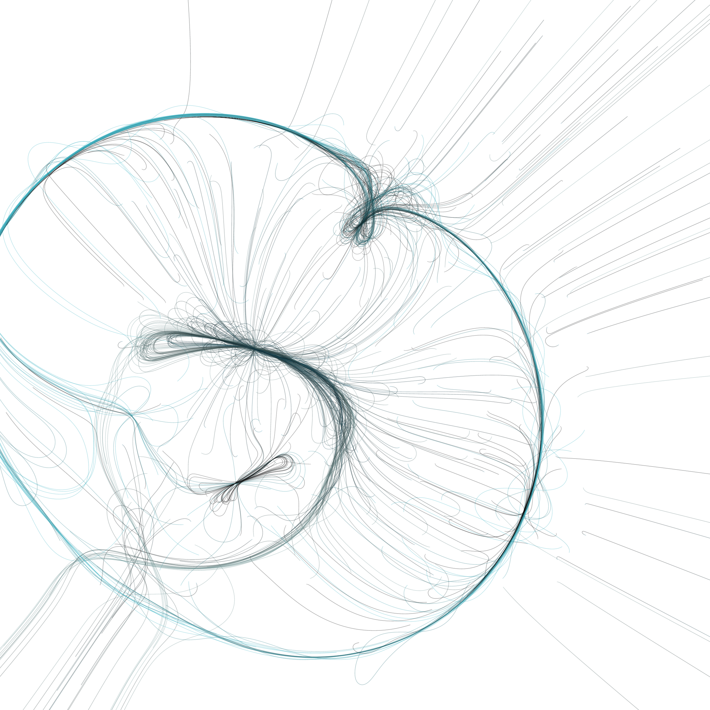 “Phototaxis” is a simulated environment populated by simple machines. After Valentino Braitenberg’s 1984 book “Vehicles,” there are four kinds of machines with different wiring and behaviors: Explorers, Aggressors, Lovers, and Cowards. Each line charts the history of one machine’s movement. The core of this code was the foundation for my MicroImage series of works dating back to 2001. I’ve worked on it in fits and starts since then, and in 2021 it was further developed for Art Blocks. Press ‘P’ to play/pause, ‘B’ for the big bang, ‘1’–’5’ to change the magnification, and ‘L’ to reveal the lights’ locations.
