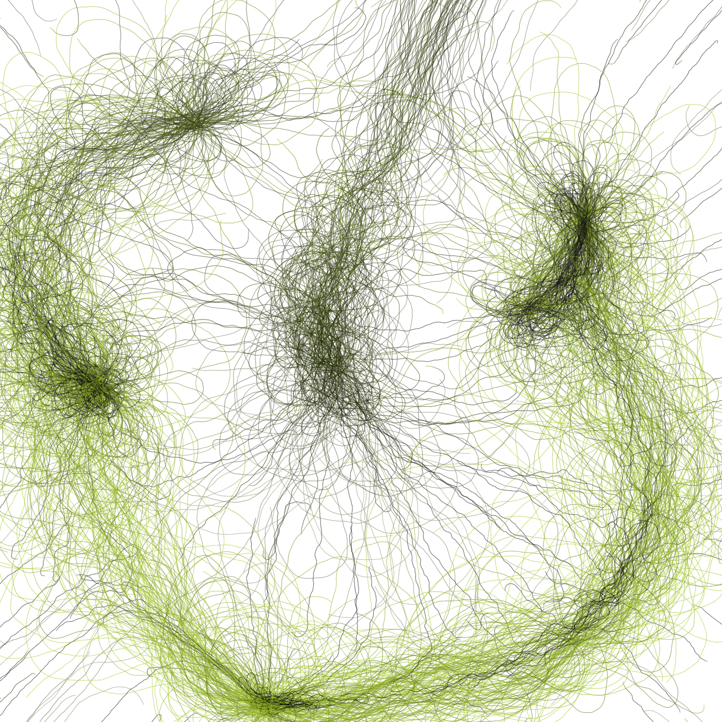 “Phototaxis” is a simulated environment populated by simple machines. After Valentino Braitenberg’s 1984 book “Vehicles,” there are four kinds of machines with different wiring and behaviors: Explorers, Aggressors, Lovers, and Cowards. Each line charts the history of one machine’s movement. The core of this code was the foundation for my MicroImage series of works dating back to 2001. I’ve worked on it in fits and starts since then, and in 2021 it was further developed for Art Blocks. Press ‘P’ to play/pause, ‘B’ for the big bang, ‘1’–’5’ to change the magnification, and ‘L’ to reveal the lights’ locations.