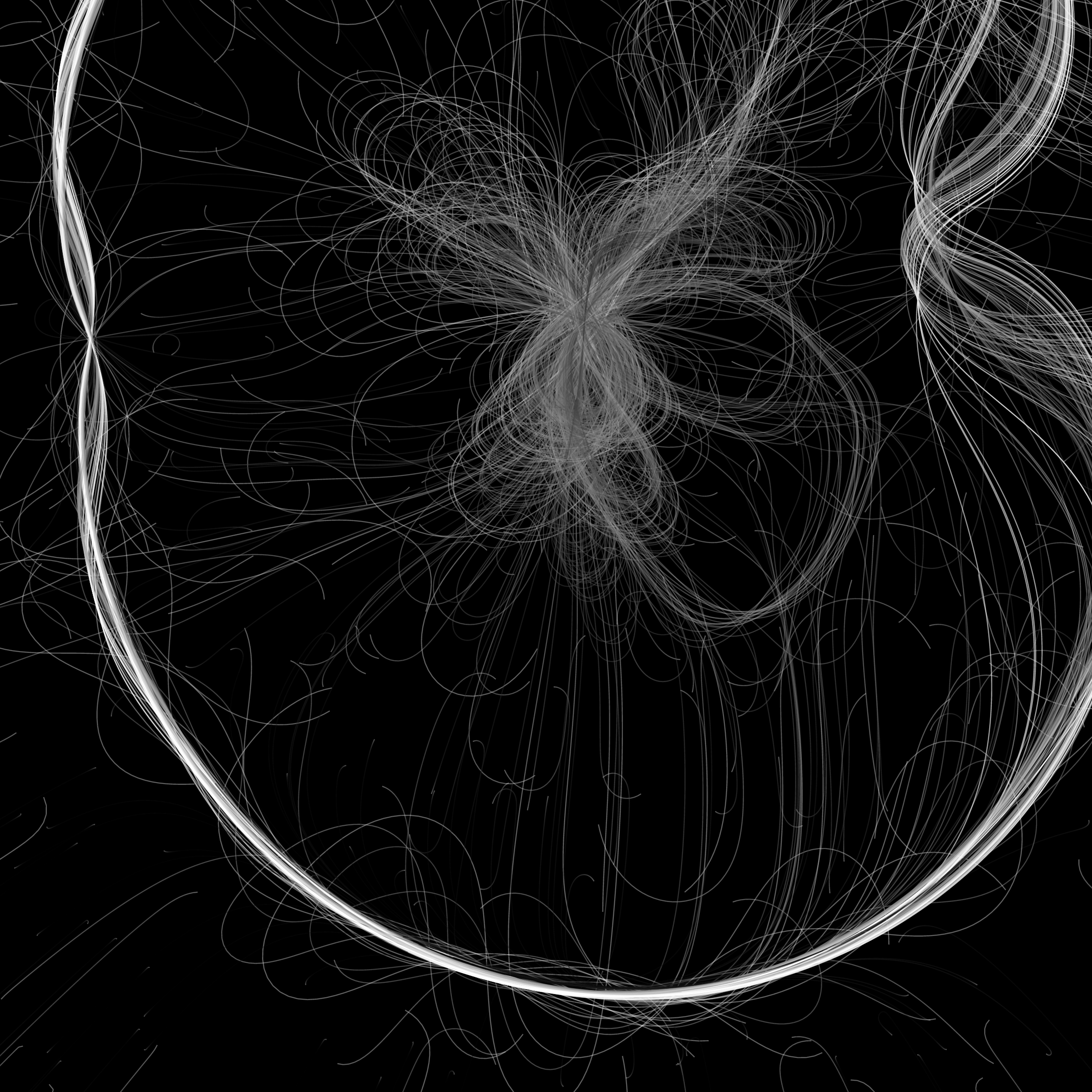 “Phototaxis” is a simulated environment populated by simple machines. After Valentino Braitenberg’s 1984 book “Vehicles,” there are four kinds of machines with different wiring and behaviors: Explorers, Aggressors, Lovers, and Cowards. Each line charts the history of one machine’s movement. The core of this code was the foundation for my MicroImage series of works dating back to 2001. I’ve worked on it in fits and starts since then, and in 2021 it was further developed for Art Blocks. Press ‘P’ to play/pause, ‘B’ for the big bang, ‘1’–’5’ to change the magnification, and ‘L’ to reveal the lights’ locations.
