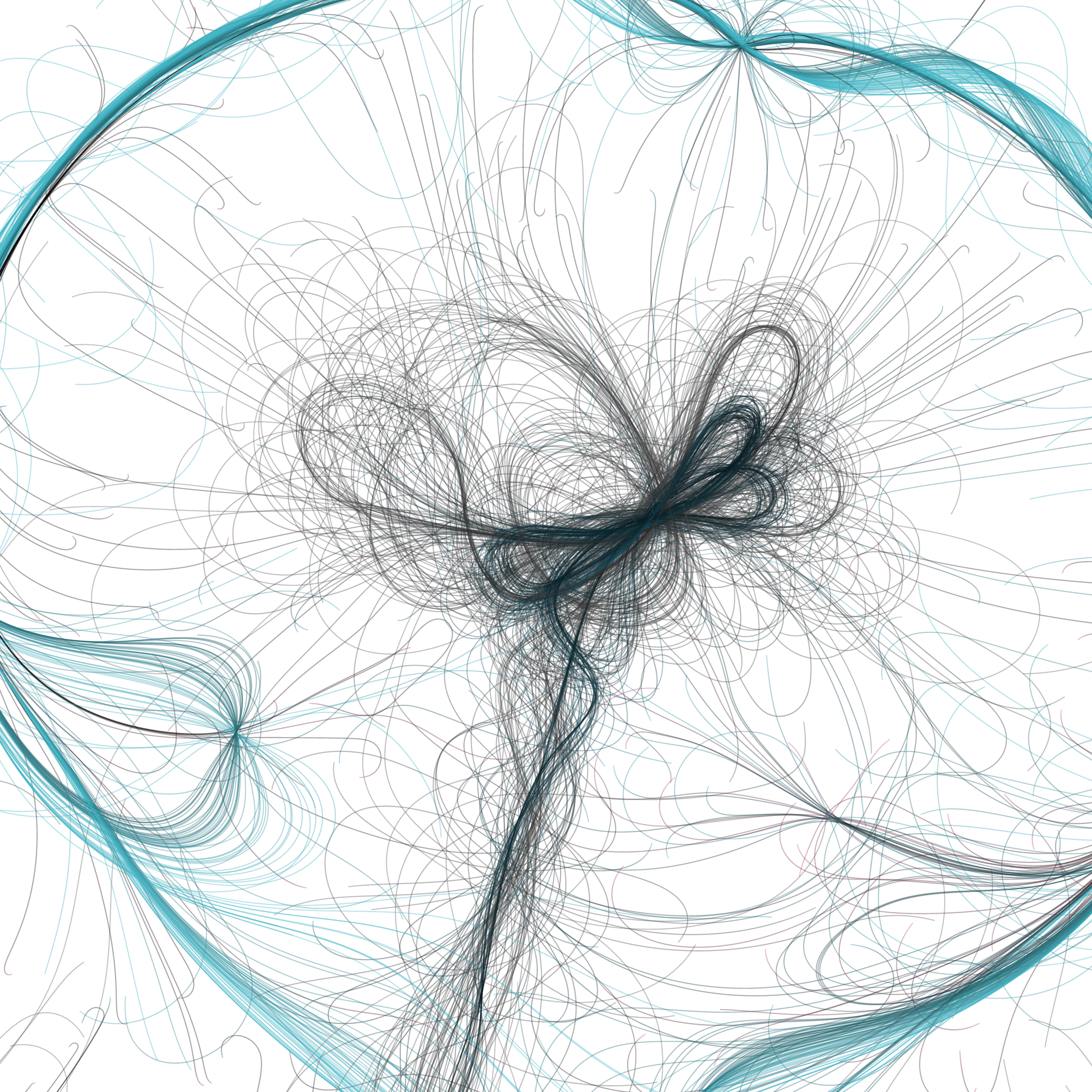“Phototaxis” is a simulated environment populated by simple machines. After Valentino Braitenberg’s 1984 book “Vehicles,” there are four kinds of machines with different wiring and behaviors: Explorers, Aggressors, Lovers, and Cowards. Each line charts the history of one machine’s movement. The core of this code was the foundation for my MicroImage series of works dating back to 2001. I’ve worked on it in fits and starts since then, and in 2021 it was further developed for Art Blocks. Press ‘P’ to play/pause, ‘B’ for the big bang, ‘1’–’5’ to change the magnification, and ‘L’ to reveal the lights’ locations.