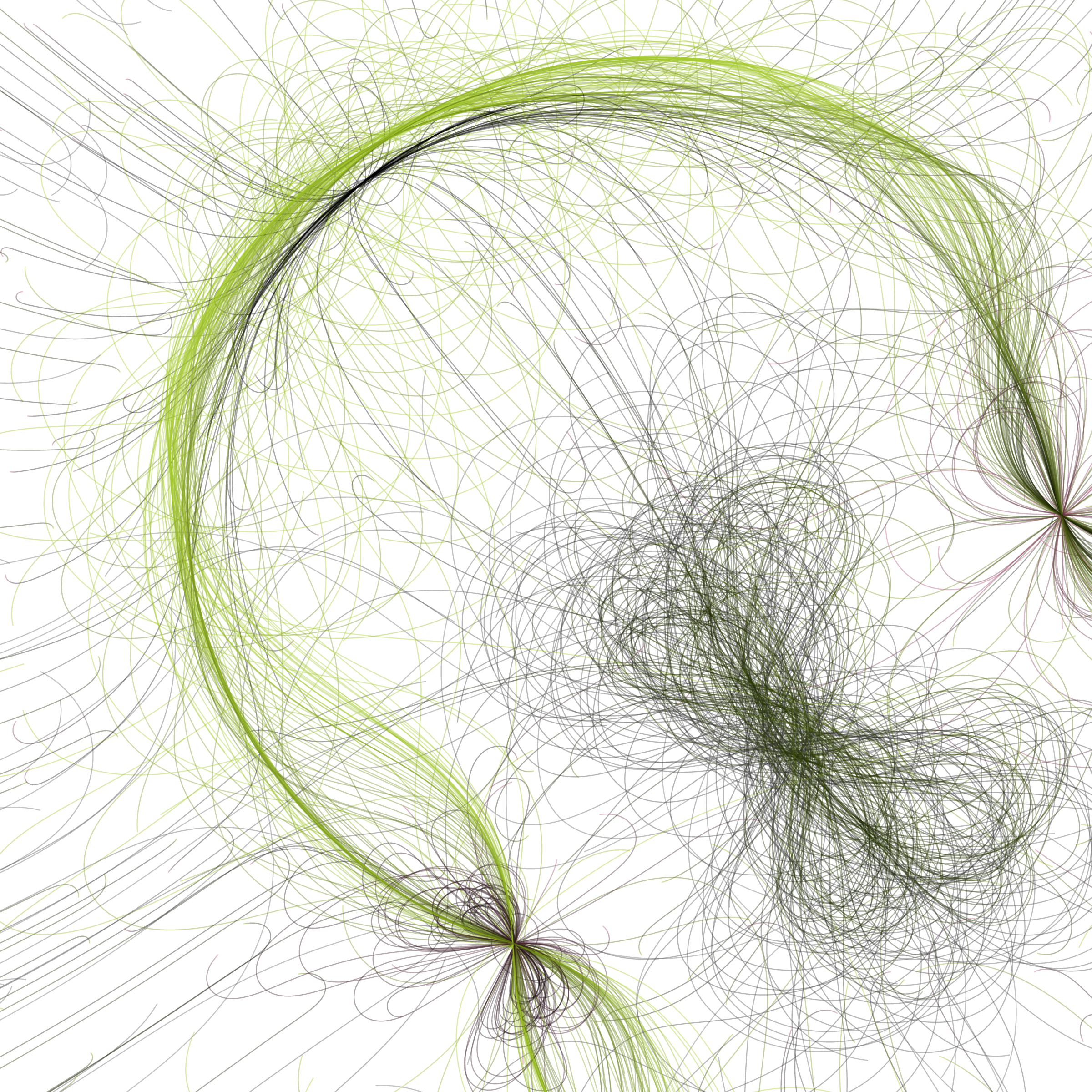 “Phototaxis” is a simulated environment populated by simple machines. After Valentino Braitenberg’s 1984 book “Vehicles,” there are four kinds of machines with different wiring and behaviors: Explorers, Aggressors, Lovers, and Cowards. Each line charts the history of one machine’s movement. The core of this code was the foundation for my MicroImage series of works dating back to 2001. I’ve worked on it in fits and starts since then, and in 2021 it was further developed for Art Blocks. Press ‘P’ to play/pause, ‘B’ for the big bang, ‘1’–’5’ to change the magnification, and ‘L’ to reveal the lights’ locations.