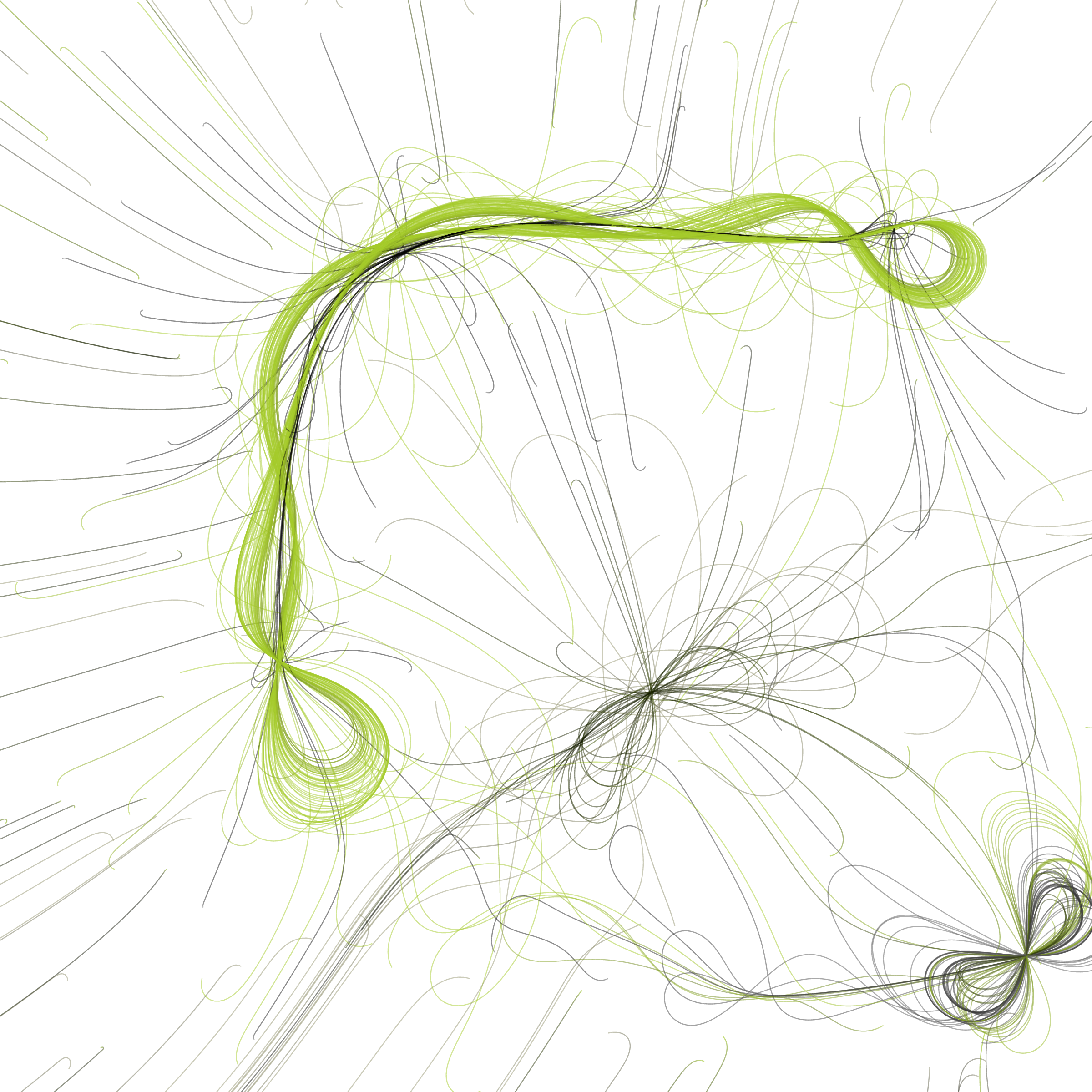 “Phototaxis” is a simulated environment populated by simple machines. After Valentino Braitenberg’s 1984 book “Vehicles,” there are four kinds of machines with different wiring and behaviors: Explorers, Aggressors, Lovers, and Cowards. Each line charts the history of one machine’s movement. The core of this code was the foundation for my MicroImage series of works dating back to 2001. I’ve worked on it in fits and starts since then, and in 2021 it was further developed for Art Blocks. Press ‘P’ to play/pause, ‘B’ for the big bang, ‘1’–’5’ to change the magnification, and ‘L’ to reveal the lights’ locations.