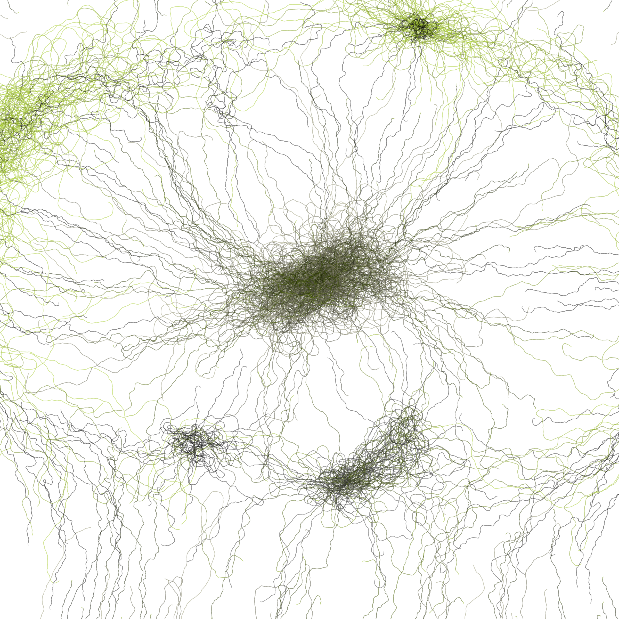 “Phototaxis” is a simulated environment populated by simple machines. After Valentino Braitenberg’s 1984 book “Vehicles,” there are four kinds of machines with different wiring and behaviors: Explorers, Aggressors, Lovers, and Cowards. Each line charts the history of one machine’s movement. The core of this code was the foundation for my MicroImage series of works dating back to 2001. I’ve worked on it in fits and starts since then, and in 2021 it was further developed for Art Blocks. Press ‘P’ to play/pause, ‘B’ for the big bang, ‘1’–’5’ to change the magnification, and ‘L’ to reveal the lights’ locations.