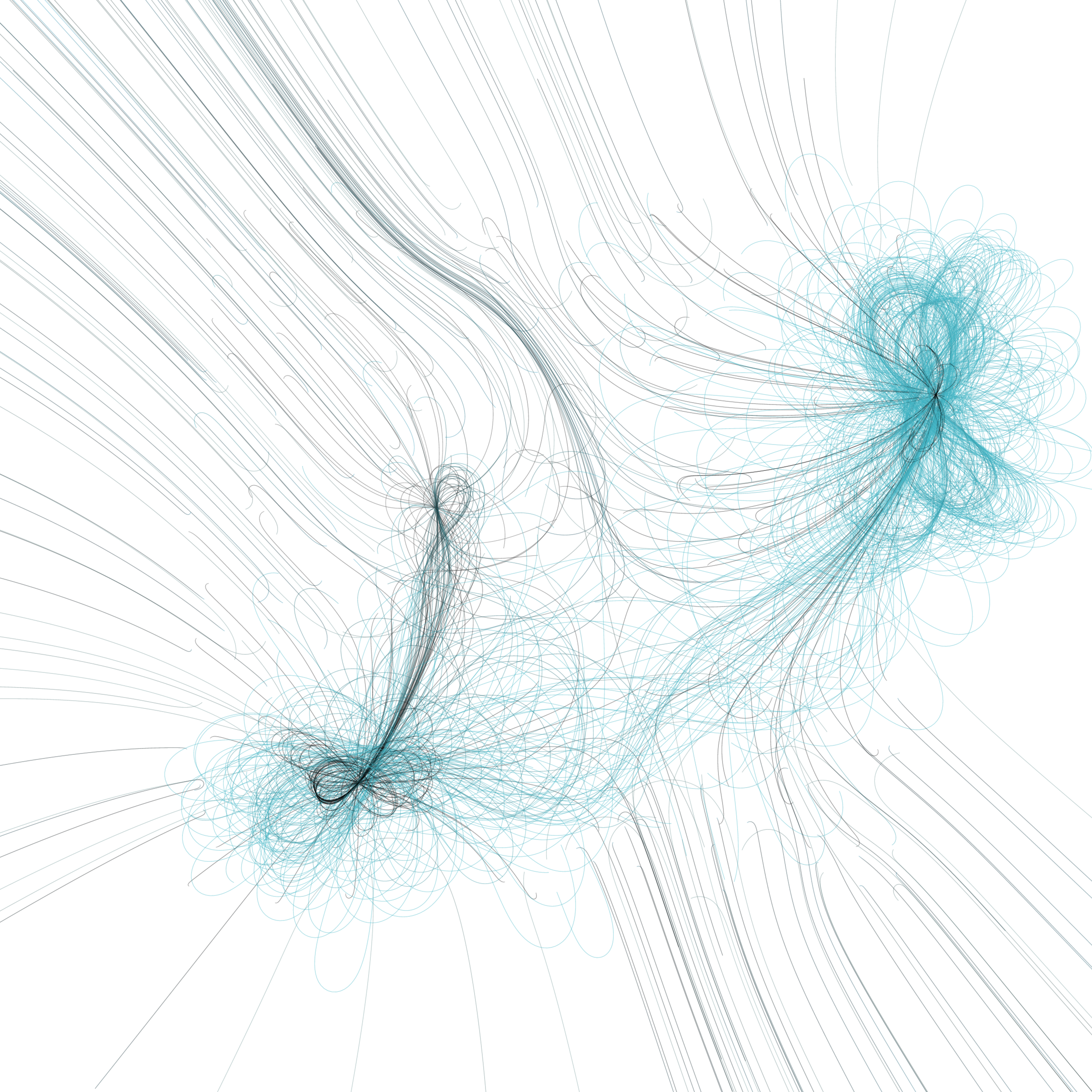 “Phototaxis” is a simulated environment populated by simple machines. After Valentino Braitenberg’s 1984 book “Vehicles,” there are four kinds of machines with different wiring and behaviors: Explorers, Aggressors, Lovers, and Cowards. Each line charts the history of one machine’s movement. The core of this code was the foundation for my MicroImage series of works dating back to 2001. I’ve worked on it in fits and starts since then, and in 2021 it was further developed for Art Blocks. Press ‘P’ to play/pause, ‘B’ for the big bang, ‘1’–’5’ to change the magnification, and ‘L’ to reveal the lights’ locations.