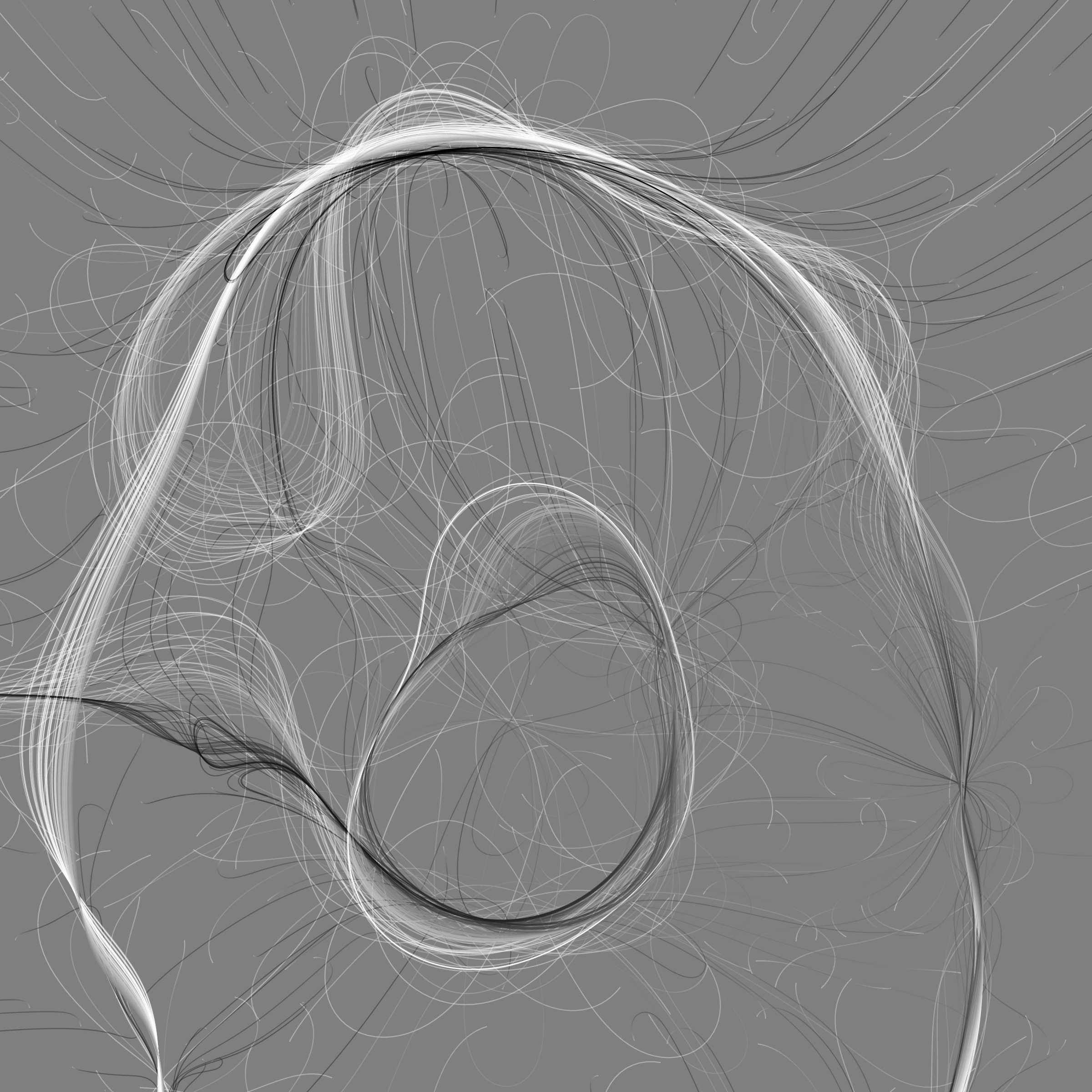 “Phototaxis” is a simulated environment populated by simple machines. After Valentino Braitenberg’s 1984 book “Vehicles,” there are four kinds of machines with different wiring and behaviors: Explorers, Aggressors, Lovers, and Cowards. Each line charts the history of one machine’s movement. The core of this code was the foundation for my MicroImage series of works dating back to 2001. I’ve worked on it in fits and starts since then, and in 2021 it was further developed for Art Blocks. Press ‘P’ to play/pause, ‘B’ for the big bang, ‘1’–’5’ to change the magnification, and ‘L’ to reveal the lights’ locations.