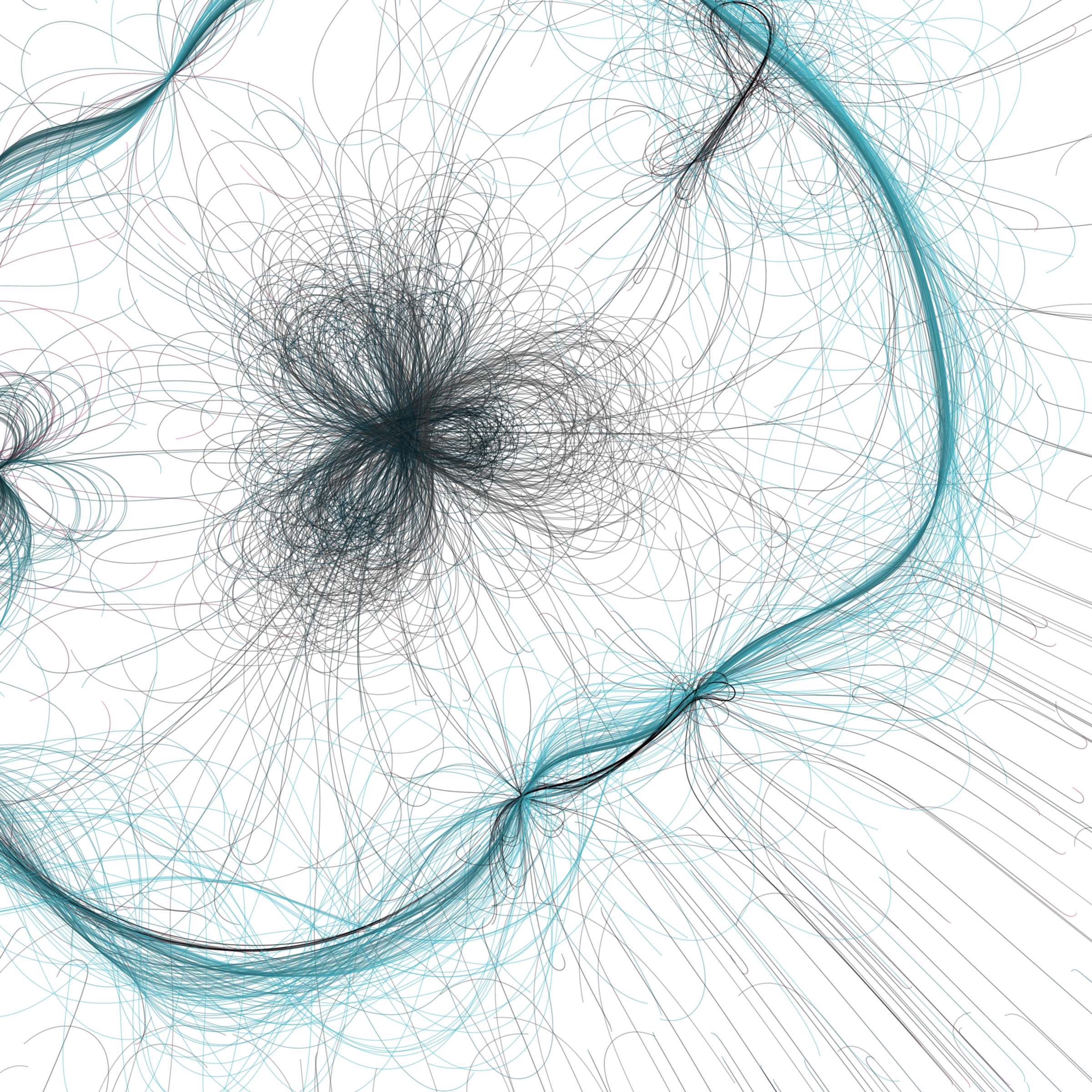 “Phototaxis” is a simulated environment populated by simple machines. After Valentino Braitenberg’s 1984 book “Vehicles,” there are four kinds of machines with different wiring and behaviors: Explorers, Aggressors, Lovers, and Cowards. Each line charts the history of one machine’s movement. The core of this code was the foundation for my MicroImage series of works dating back to 2001. I’ve worked on it in fits and starts since then, and in 2021 it was further developed for Art Blocks. Press ‘P’ to play/pause, ‘B’ for the big bang, ‘1’–’5’ to change the magnification, and ‘L’ to reveal the lights’ locations.