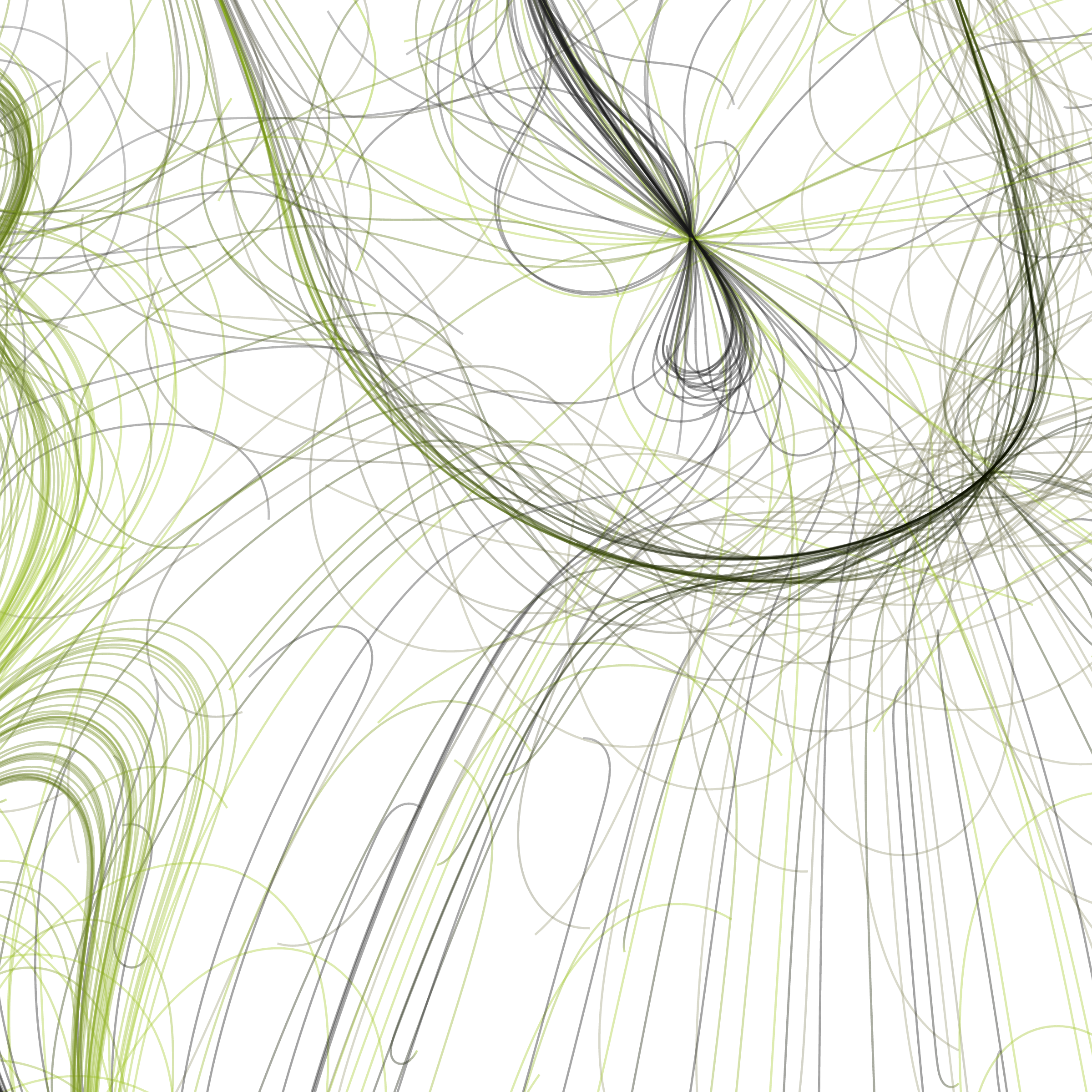 “Phototaxis” is a simulated environment populated by simple machines. After Valentino Braitenberg’s 1984 book “Vehicles,” there are four kinds of machines with different wiring and behaviors: Explorers, Aggressors, Lovers, and Cowards. Each line charts the history of one machine’s movement. The core of this code was the foundation for my MicroImage series of works dating back to 2001. I’ve worked on it in fits and starts since then, and in 2021 it was further developed for Art Blocks. Press ‘P’ to play/pause, ‘B’ for the big bang, ‘1’–’5’ to change the magnification, and ‘L’ to reveal the lights’ locations.