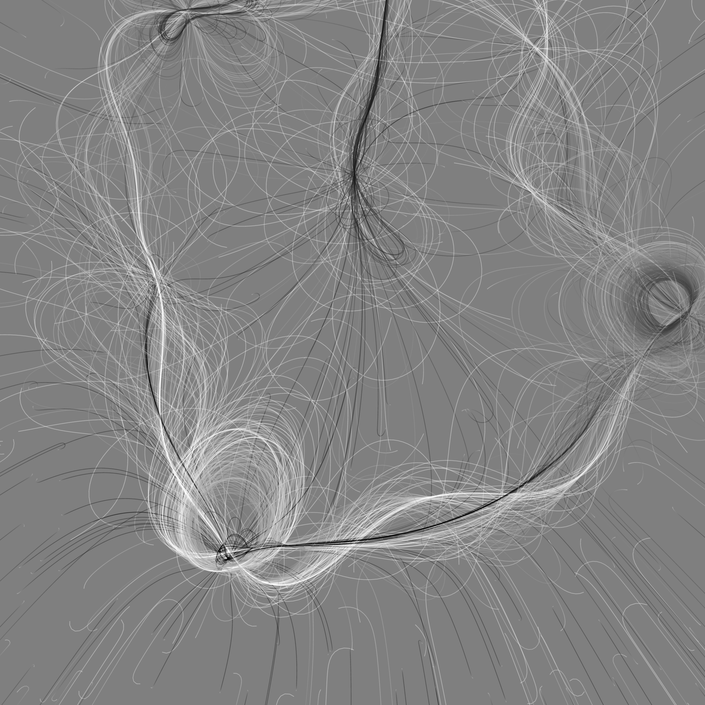 “Phototaxis” is a simulated environment populated by simple machines. After Valentino Braitenberg’s 1984 book “Vehicles,” there are four kinds of machines with different wiring and behaviors: Explorers, Aggressors, Lovers, and Cowards. Each line charts the history of one machine’s movement. The core of this code was the foundation for my MicroImage series of works dating back to 2001. I’ve worked on it in fits and starts since then, and in 2021 it was further developed for Art Blocks. Press ‘P’ to play/pause, ‘B’ for the big bang, ‘1’–’5’ to change the magnification, and ‘L’ to reveal the lights’ locations.