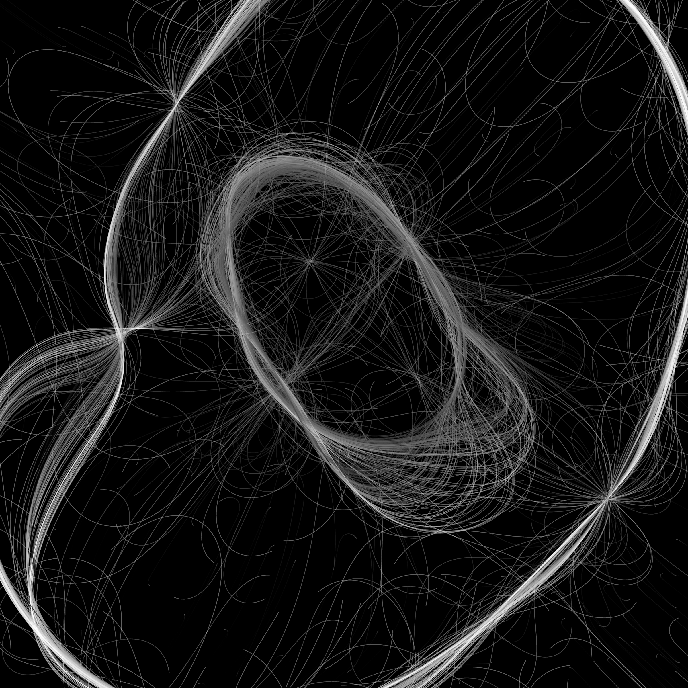 “Phototaxis” is a simulated environment populated by simple machines. After Valentino Braitenberg’s 1984 book “Vehicles,” there are four kinds of machines with different wiring and behaviors: Explorers, Aggressors, Lovers, and Cowards. Each line charts the history of one machine’s movement. The core of this code was the foundation for my MicroImage series of works dating back to 2001. I’ve worked on it in fits and starts since then, and in 2021 it was further developed for Art Blocks. Press ‘P’ to play/pause, ‘B’ for the big bang, ‘1’–’5’ to change the magnification, and ‘L’ to reveal the lights’ locations.