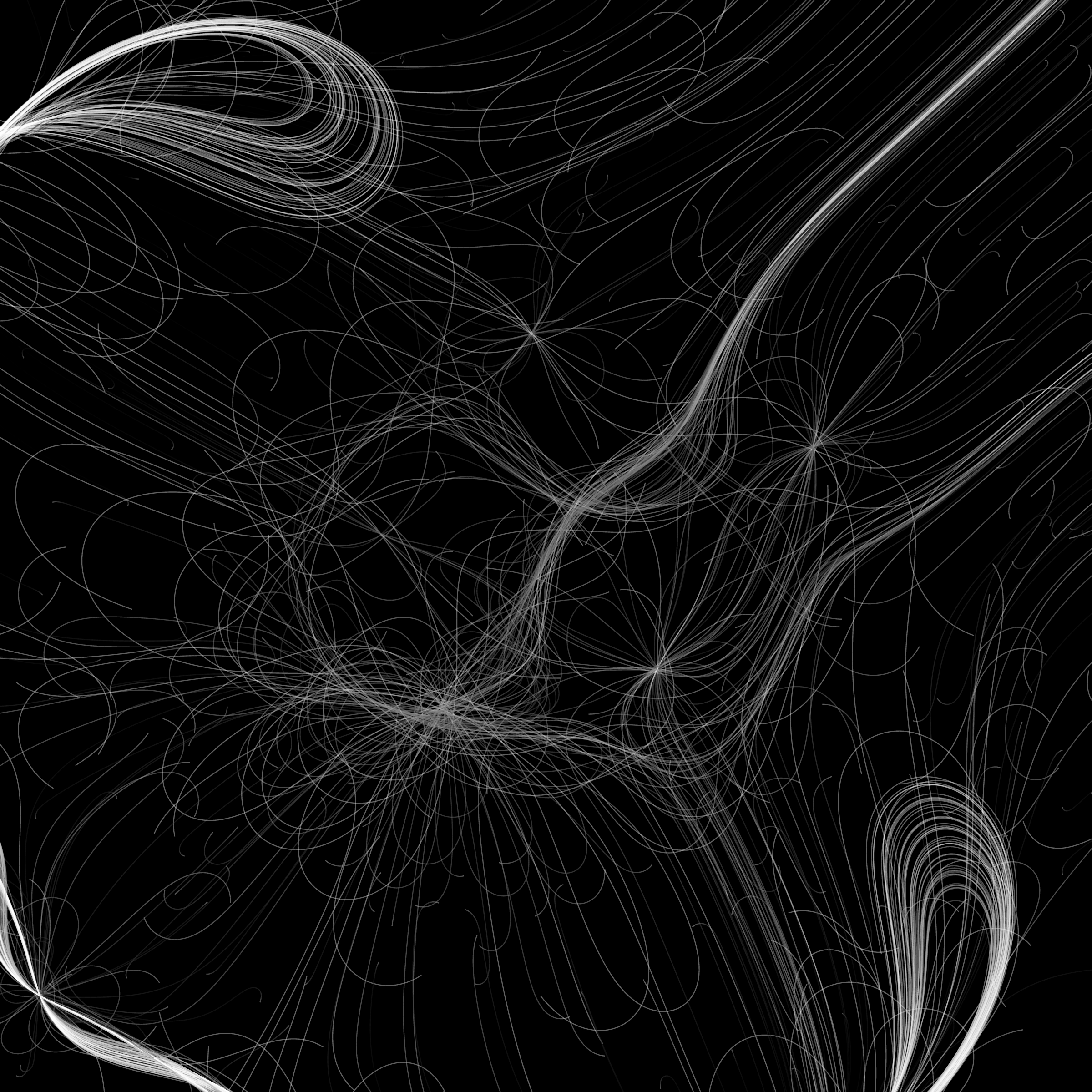 “Phototaxis” is a simulated environment populated by simple machines. After Valentino Braitenberg’s 1984 book “Vehicles,” there are four kinds of machines with different wiring and behaviors: Explorers, Aggressors, Lovers, and Cowards. Each line charts the history of one machine’s movement. The core of this code was the foundation for my MicroImage series of works dating back to 2001. I’ve worked on it in fits and starts since then, and in 2021 it was further developed for Art Blocks. Press ‘P’ to play/pause, ‘B’ for the big bang, ‘1’–’5’ to change the magnification, and ‘L’ to reveal the lights’ locations.