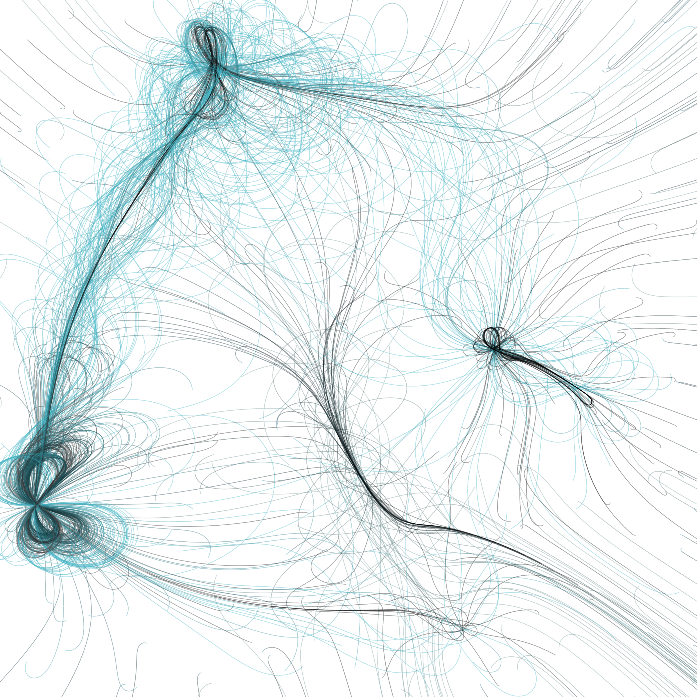 “Phototaxis” is a simulated environment populated by simple machines. After Valentino Braitenberg’s 1984 book “Vehicles,” there are four kinds of machines with different wiring and behaviors: Explorers, Aggressors, Lovers, and Cowards. Each line charts the history of one machine’s movement. The core of this code was the foundation for my MicroImage series of works dating back to 2001. I’ve worked on it in fits and starts since then, and in 2021 it was further developed for Art Blocks. Press ‘P’ to play/pause, ‘B’ for the big bang, ‘1’–’5’ to change the magnification, and ‘L’ to reveal the lights’ locations.
