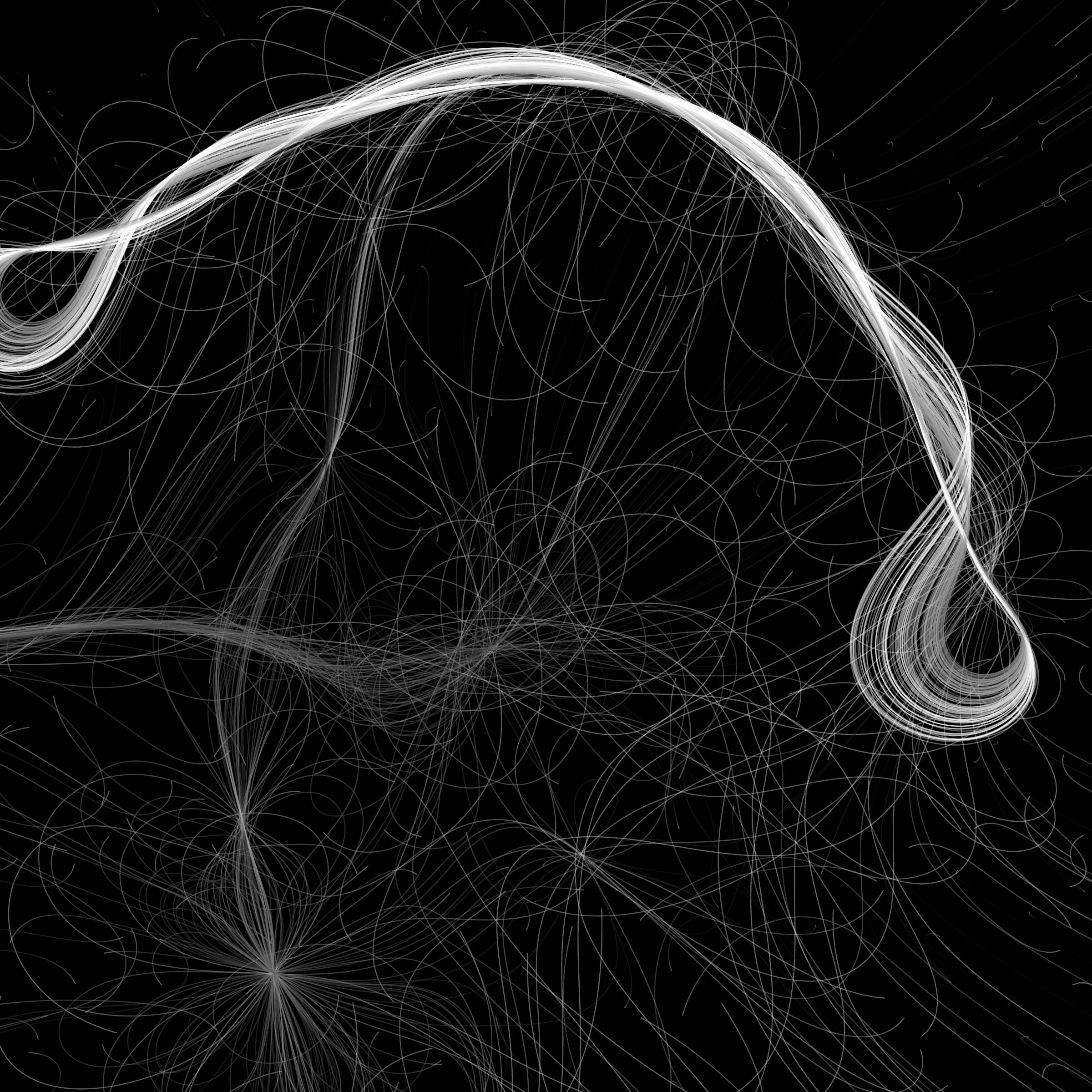 “Phototaxis” is a simulated environment populated by simple machines. After Valentino Braitenberg’s 1984 book “Vehicles,” there are four kinds of machines with different wiring and behaviors: Explorers, Aggressors, Lovers, and Cowards. Each line charts the history of one machine’s movement. The core of this code was the foundation for my MicroImage series of works dating back to 2001. I’ve worked on it in fits and starts since then, and in 2021 it was further developed for Art Blocks. Press ‘P’ to play/pause, ‘B’ for the big bang, ‘1’–’5’ to change the magnification, and ‘L’ to reveal the lights’ locations.