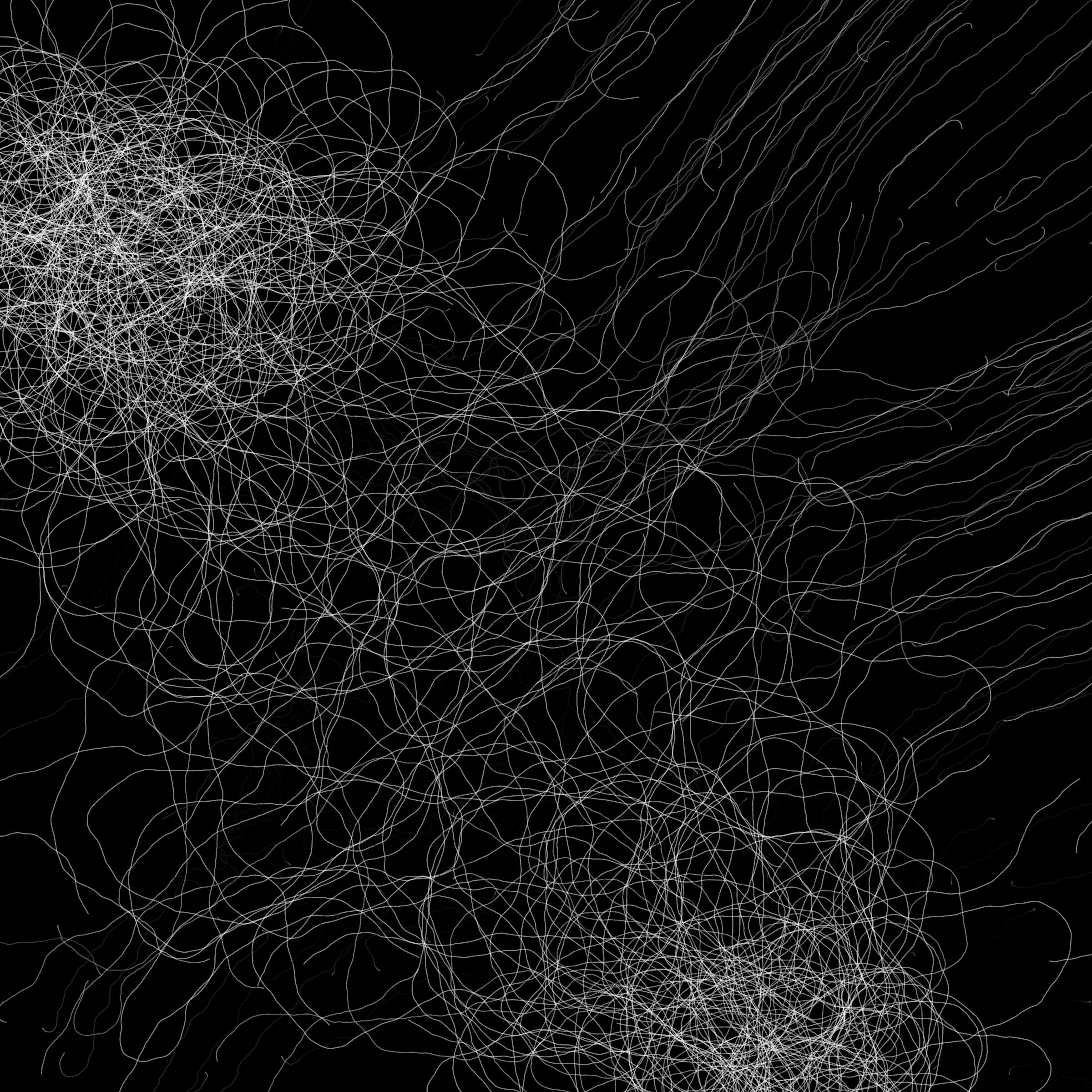 “Phototaxis” is a simulated environment populated by simple machines. After Valentino Braitenberg’s 1984 book “Vehicles,” there are four kinds of machines with different wiring and behaviors: Explorers, Aggressors, Lovers, and Cowards. Each line charts the history of one machine’s movement. The core of this code was the foundation for my MicroImage series of works dating back to 2001. I’ve worked on it in fits and starts since then, and in 2021 it was further developed for Art Blocks. Press ‘P’ to play/pause, ‘B’ for the big bang, ‘1’–’5’ to change the magnification, and ‘L’ to reveal the lights’ locations.