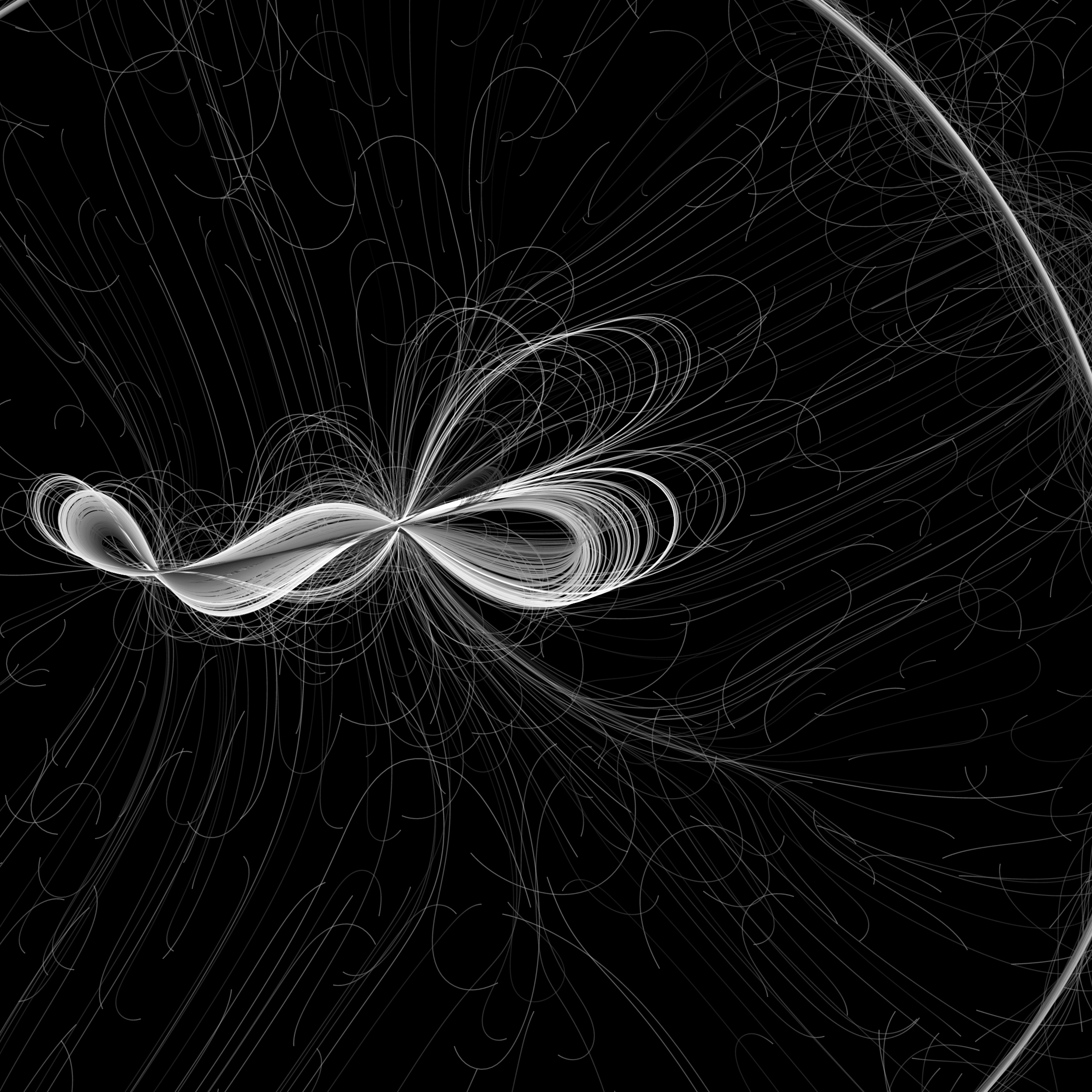 “Phototaxis” is a simulated environment populated by simple machines. After Valentino Braitenberg’s 1984 book “Vehicles,” there are four kinds of machines with different wiring and behaviors: Explorers, Aggressors, Lovers, and Cowards. Each line charts the history of one machine’s movement. The core of this code was the foundation for my MicroImage series of works dating back to 2001. I’ve worked on it in fits and starts since then, and in 2021 it was further developed for Art Blocks. Press ‘P’ to play/pause, ‘B’ for the big bang, ‘1’–’5’ to change the magnification, and ‘L’ to reveal the lights’ locations.