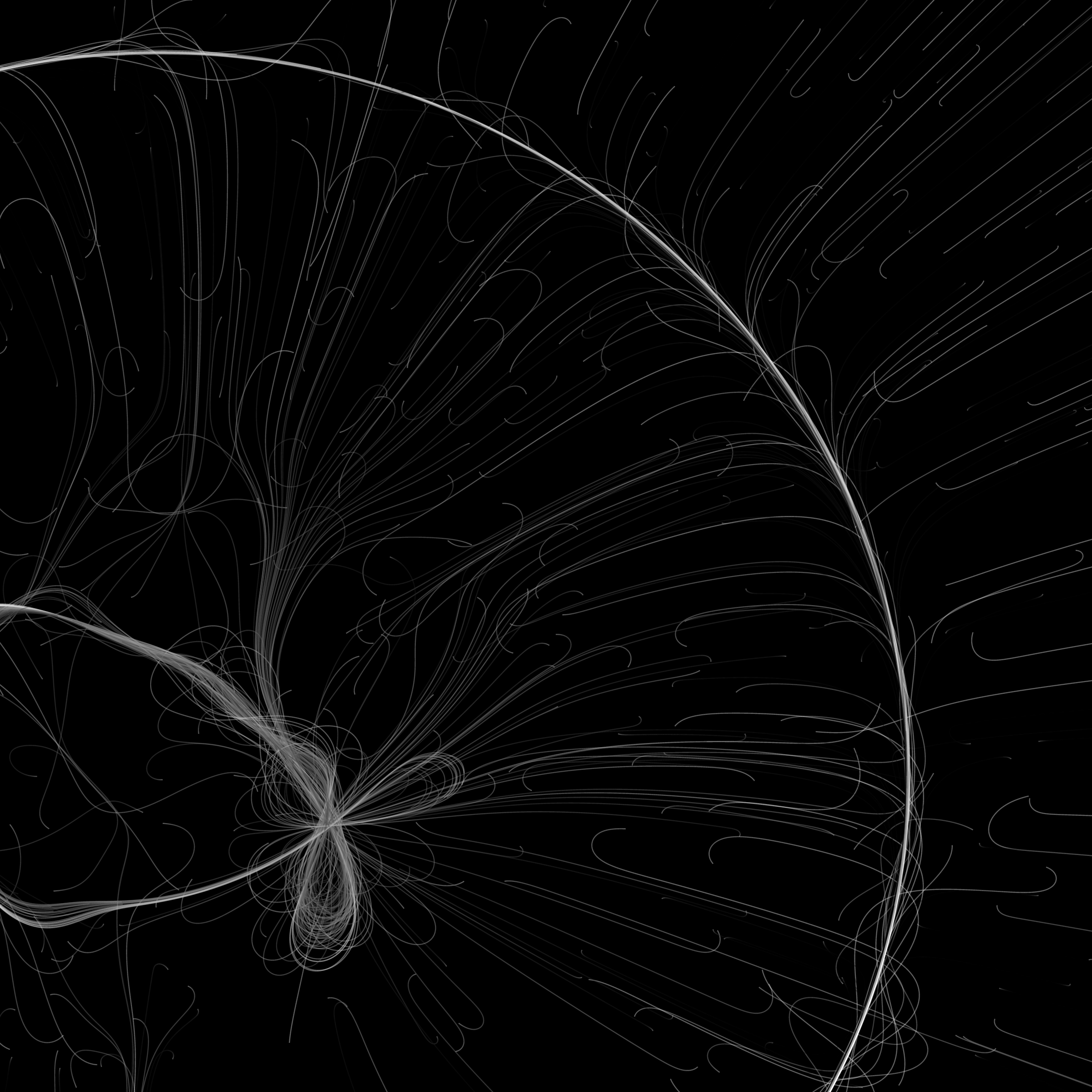 “Phototaxis” is a simulated environment populated by simple machines. After Valentino Braitenberg’s 1984 book “Vehicles,” there are four kinds of machines with different wiring and behaviors: Explorers, Aggressors, Lovers, and Cowards. Each line charts the history of one machine’s movement. The core of this code was the foundation for my MicroImage series of works dating back to 2001. I’ve worked on it in fits and starts since then, and in 2021 it was further developed for Art Blocks. Press ‘P’ to play/pause, ‘B’ for the big bang, ‘1’–’5’ to change the magnification, and ‘L’ to reveal the lights’ locations.