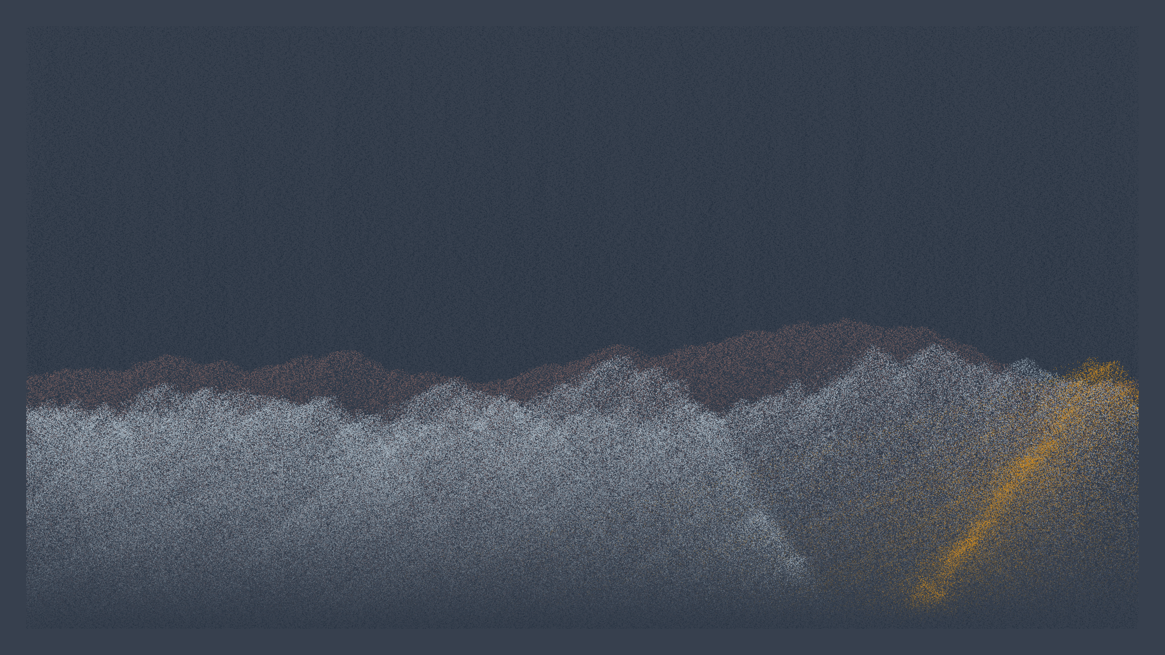 The Pointila algorithm first divides the canvas into columns. It then traverses the canvas dropping dots along those columns. From just a handful of layers, landscapes emerge. They take on a variety of forms: from rolling plains and steep canyons to jagged peaks and dreamy moors. Some are sharp and tense, others hazy and ethereal. They are coloured with handpicked palettes and animated with bold glitches – a nod to the shared optics of Pointillism and pixels.