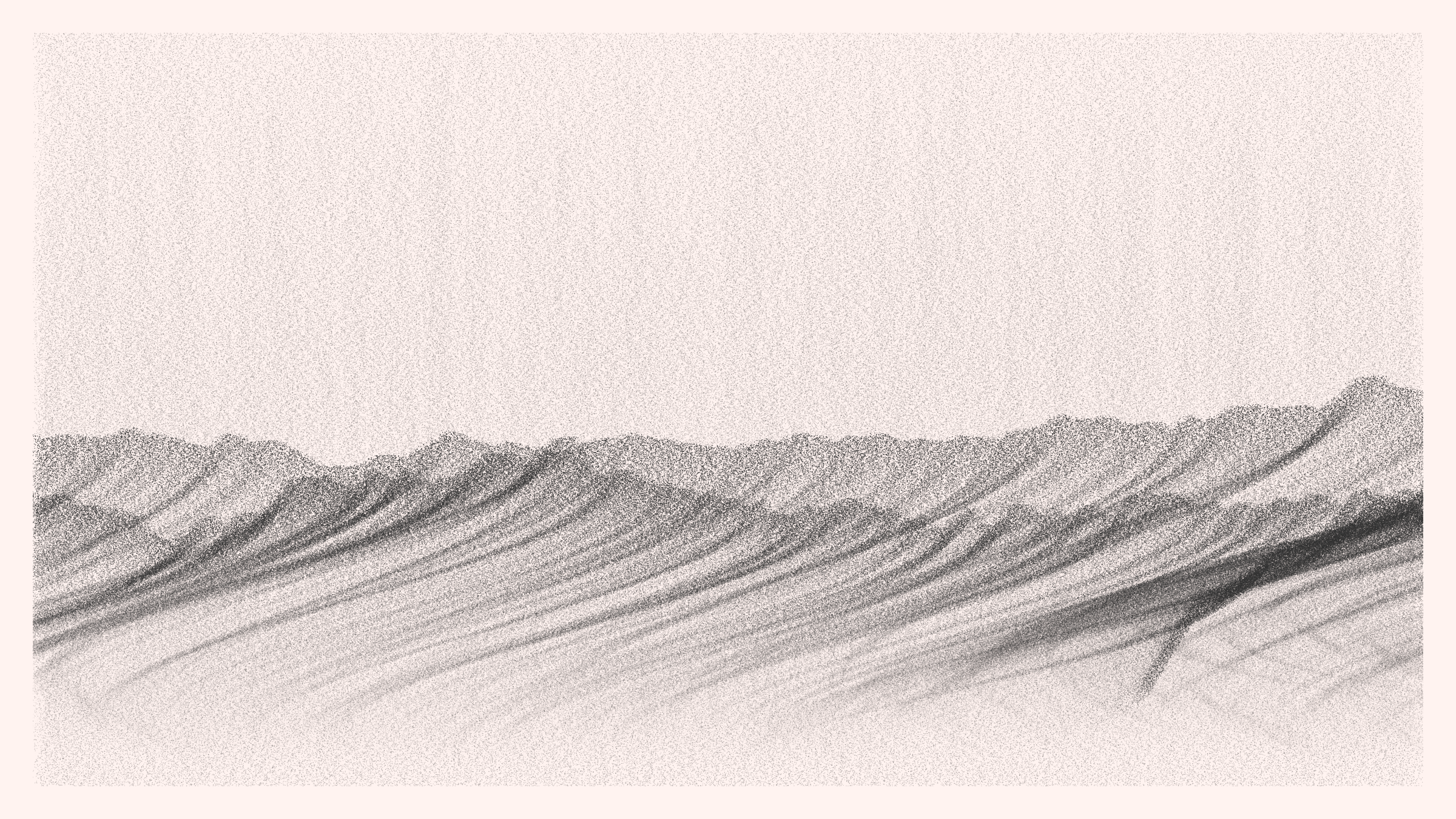 The Pointila algorithm first divides the canvas into columns. It then traverses the canvas dropping dots along those columns. From just a handful of layers, landscapes emerge. They take on a variety of forms: from rolling plains and steep canyons to jagged peaks and dreamy moors. Some are sharp and tense, others hazy and ethereal. They are coloured with handpicked palettes and animated with bold glitches – a nod to the shared optics of Pointillism and pixels.