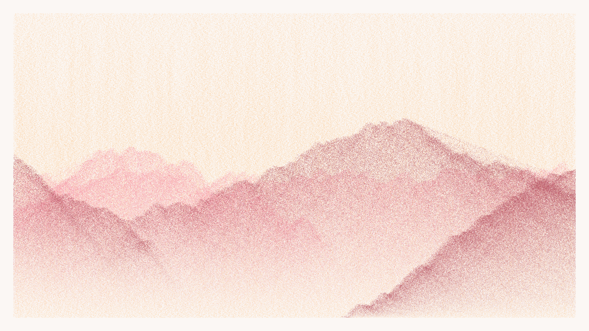 The Pointila algorithm first divides the canvas into columns. It then traverses the canvas dropping dots along those columns. From just a handful of layers, landscapes emerge. They take on a variety of forms: from rolling plains and steep canyons to jagged peaks and dreamy moors. Some are sharp and tense, others hazy and ethereal. They are coloured with handpicked palettes and animated with bold glitches – a nod to the shared optics of Pointillism and pixels.