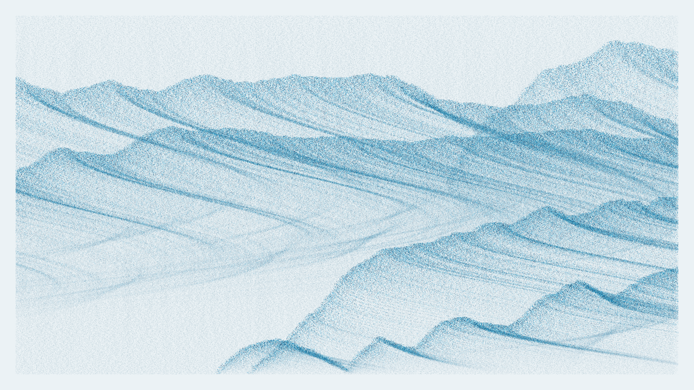 The Pointila algorithm first divides the canvas into columns. It then traverses the canvas dropping dots along those columns. From just a handful of layers, landscapes emerge. They take on a variety of forms: from rolling plains and steep canyons to jagged peaks and dreamy moors. Some are sharp and tense, others hazy and ethereal. They are coloured with handpicked palettes and animated with bold glitches – a nod to the shared optics of Pointillism and pixels.