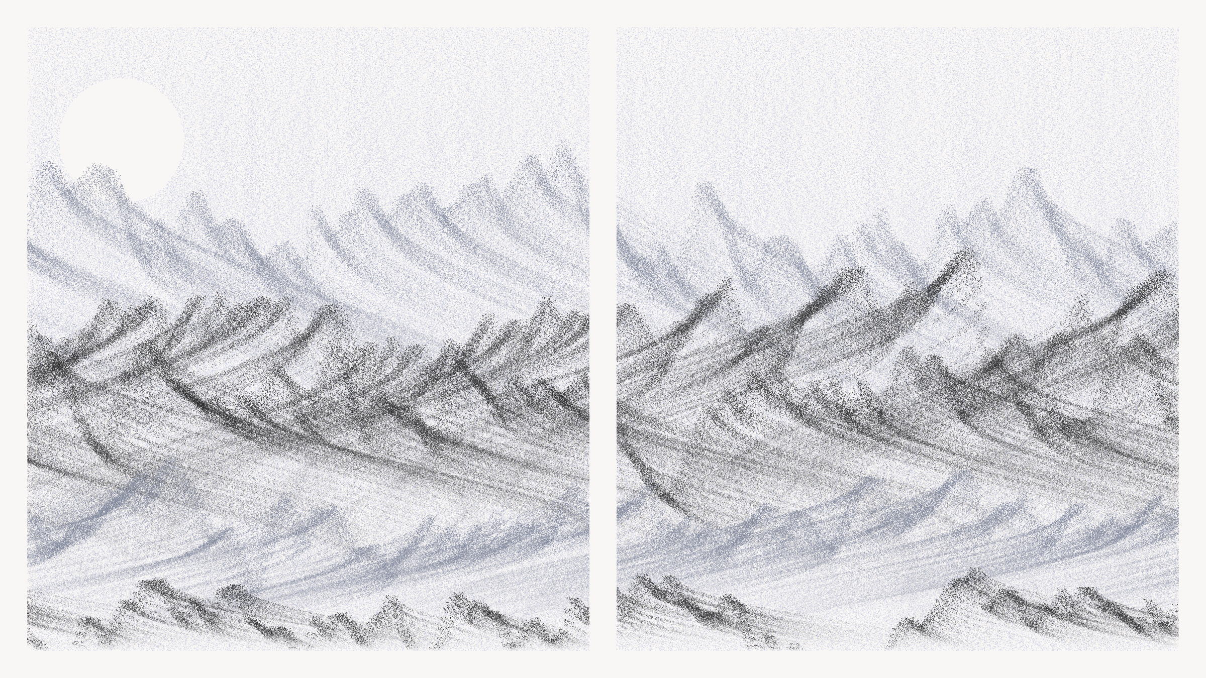 The Pointila algorithm first divides the canvas into columns. It then traverses the canvas dropping dots along those columns. From just a handful of layers, landscapes emerge. They take on a variety of forms: from rolling plains and steep canyons to jagged peaks and dreamy moors. Some are sharp and tense, others hazy and ethereal. They are coloured with handpicked palettes and animated with bold glitches – a nod to the shared optics of Pointillism and pixels.